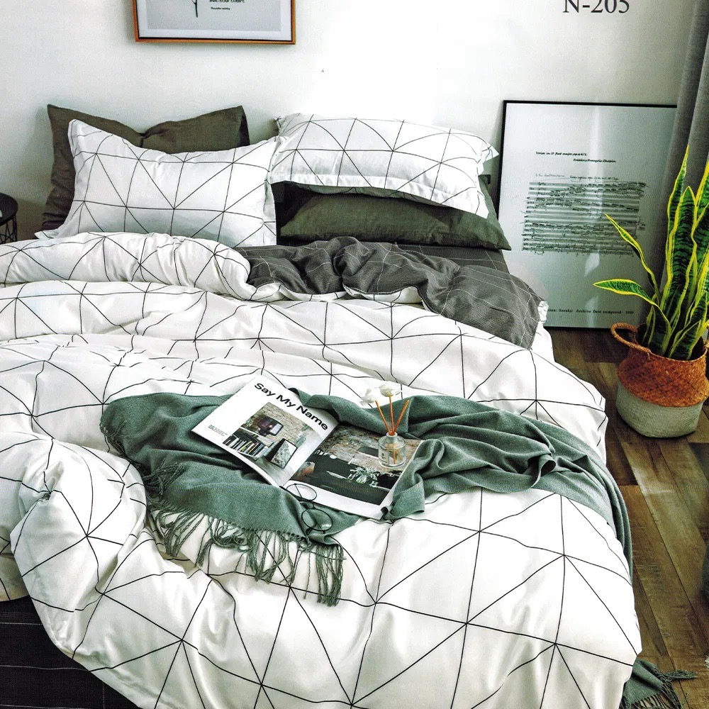Lenjerie pat dublu, bumbac satinat, cu doua feţe, 4 piese, Alb, Gri, dungi, forme geometrice, Casa Creativ Elegant Pucioasa, cod produs: BCC-LBS32