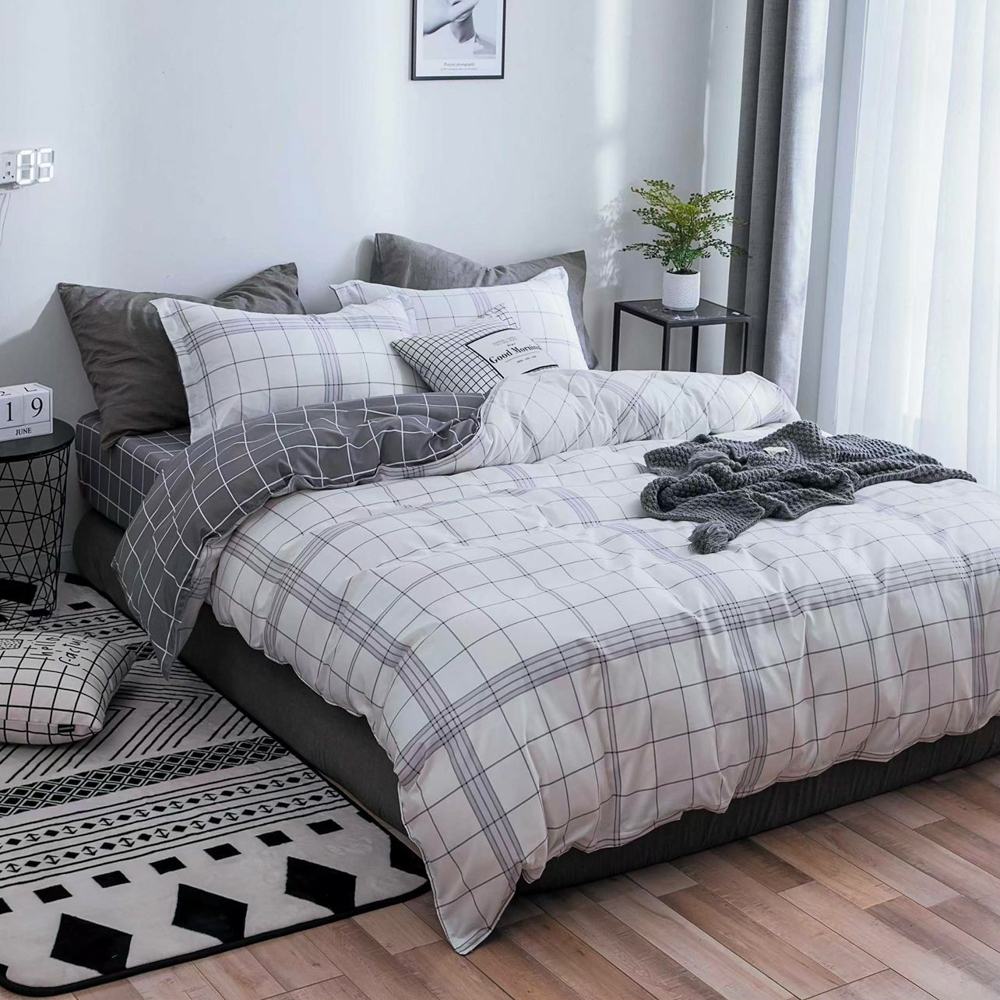 Lenjerie pat dublu cu doua feţe, bumbac satinat, 4 piese, Alb, Gri, patratele, Johny Home Pucioasa, cod produs: SPR-A50-669
