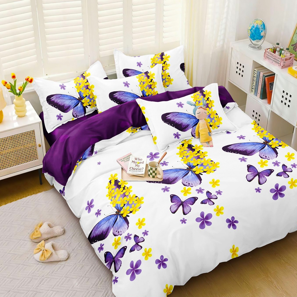 Lenjerie pat dublu cu doua feţe, bumbac satinat, 4 piese, Alb, Mov, fluturi, Johny Home Pucioasa, cod produs: SPR-A50-688