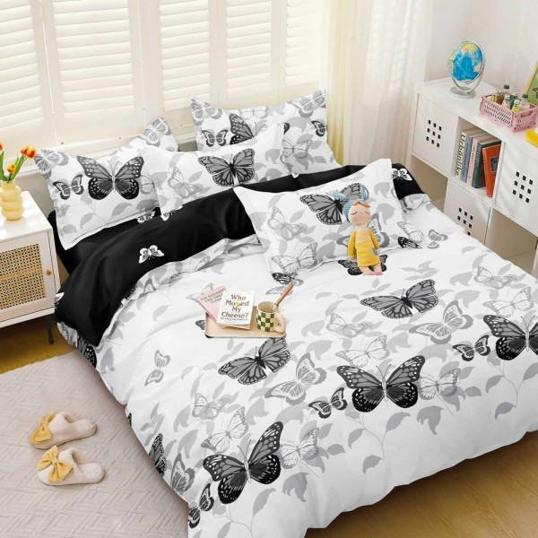 Lenjerie pat dublu cu doua feţe, bumbac satinat, 4 piese, Alb, Negru, fluturi, Johny Home Pucioasa, cod produs: SPR-A50-667