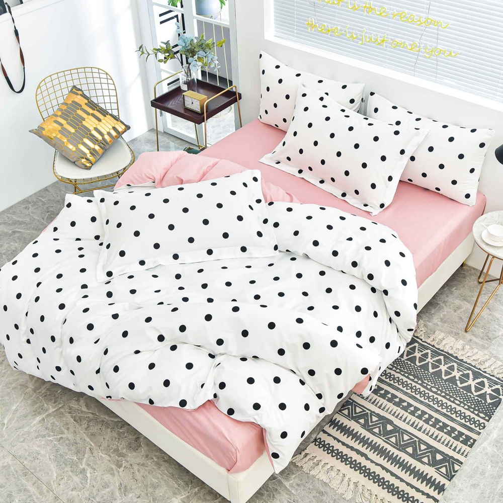 Lenjerie pat dublu cu doua feţe, bumbac satinat, 4 piese, Alb, Roz, buline, Johny Home Pucioasa, cod produs: SPR-A50-676