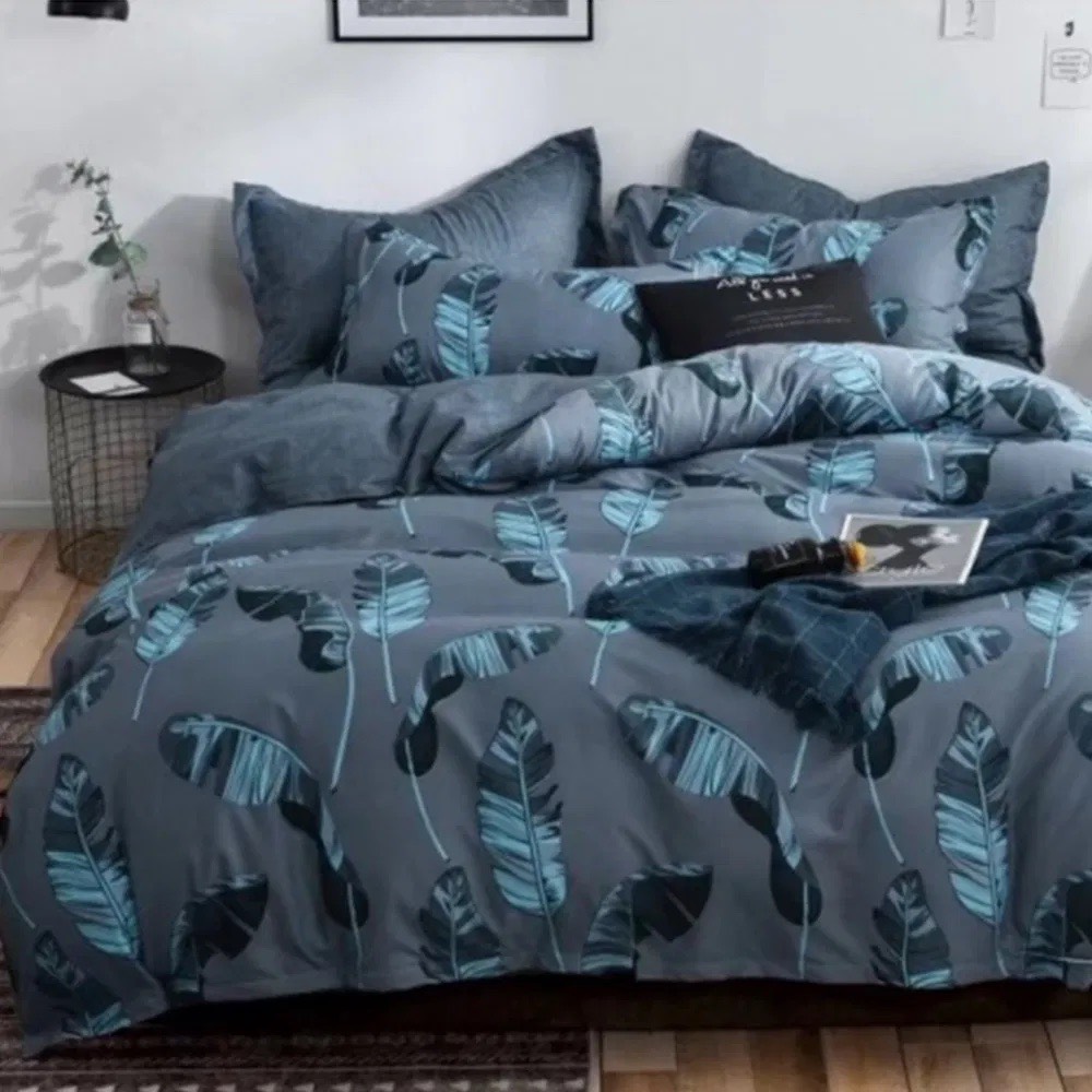 Lenjerie pat dublu, bumbac satinat, cu doua feţe, 4 piese, Gri Albăstrui, frunze, Casa Creativ Elegant Pucioasa, cod produs: BCC-LBS43