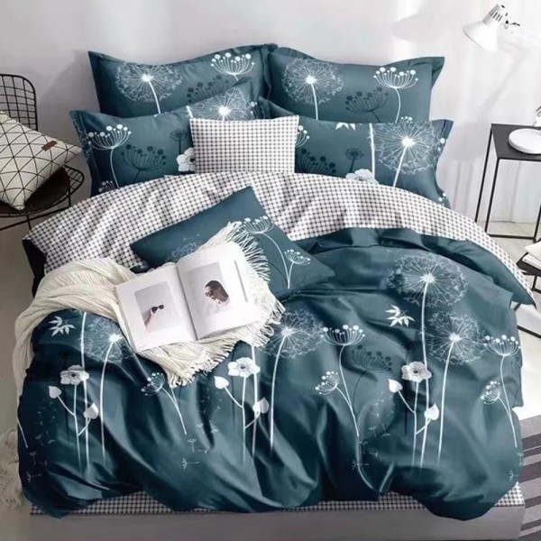 Lenjerie pat dublu, bumbac satinat, cu doua feţe, 4 piese, Petrol, Alb, papadii, Casa Creativ Elegant Pucioasa, cod produs: BCC-LBS51