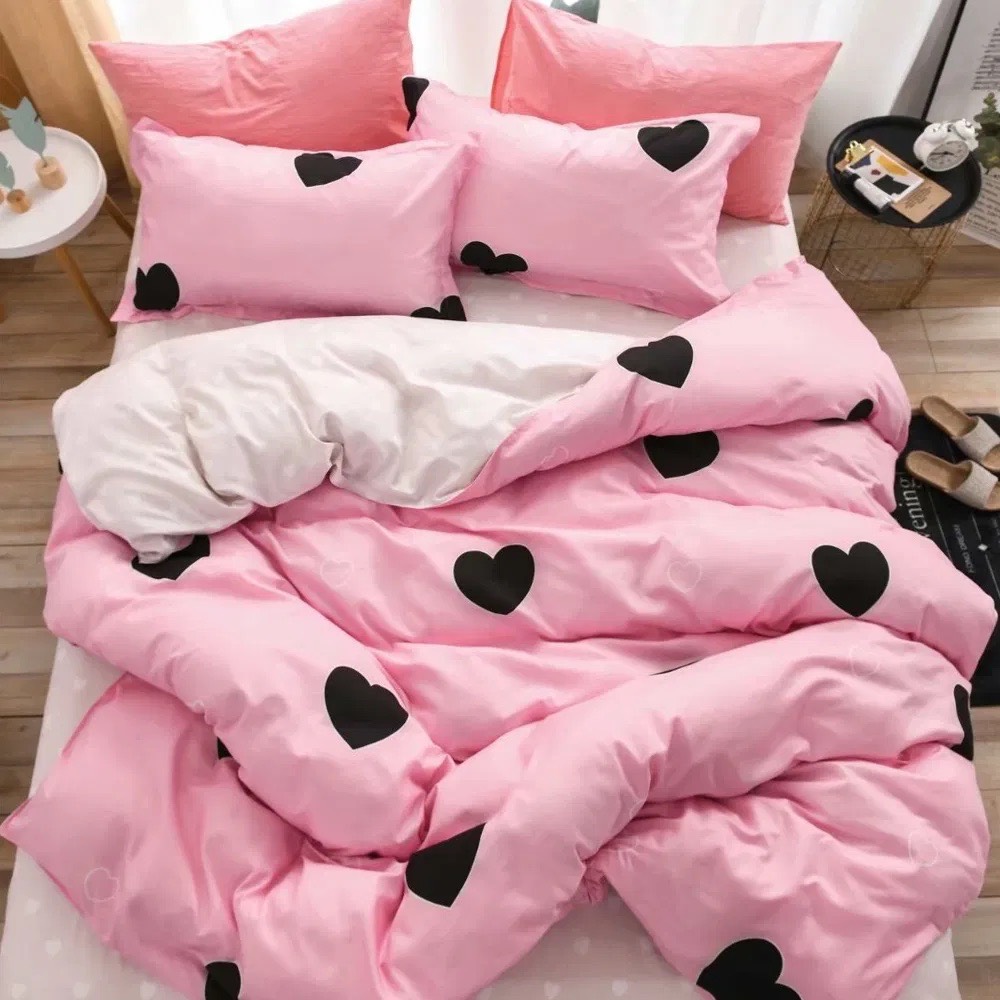 Lenjerie pat dublu, bumbac satinat, cu doua feţe, 4 piese, Roz, Crem, inimioare, Casa Creativ Elegant Pucioasa, cod produs: BCC-LBS17