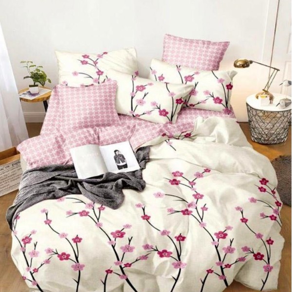 Lenjerie pat dublu cu doua feţe, bumbac satinat, 4 piese, Roz, flori de cires, Johny Home Pucioasa, cod produs: SPR-A50-551