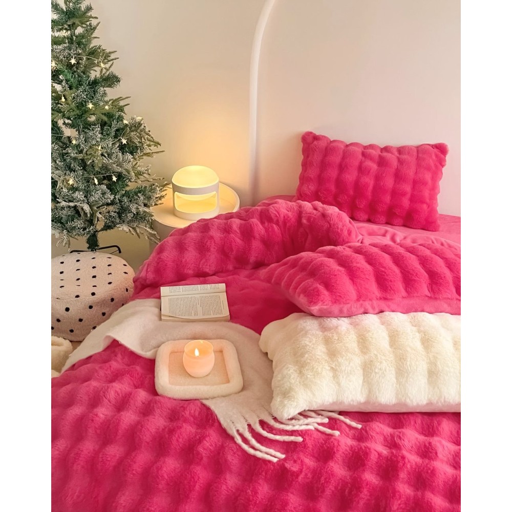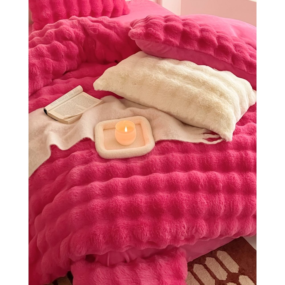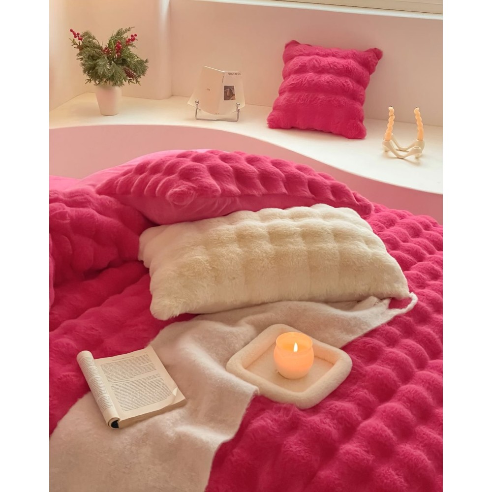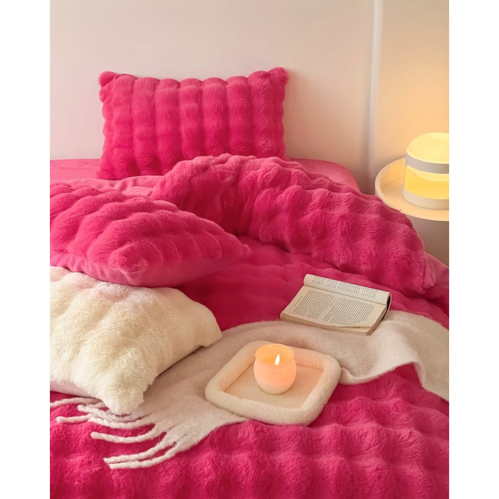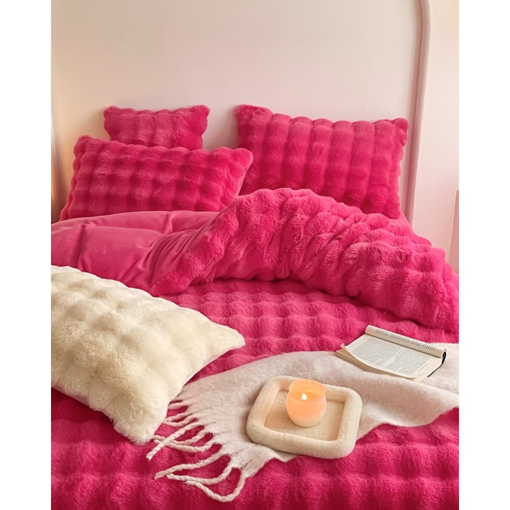 Lenjerie de Pat Dublu, ExtraPufoasa din Blăniță Artificială de Iepure, 4 piese, Fuchsya – Confort Premium și Eleganță Absolută, Casa Creativ Elegant Pucioasa, cod produs: BCC-BY-05