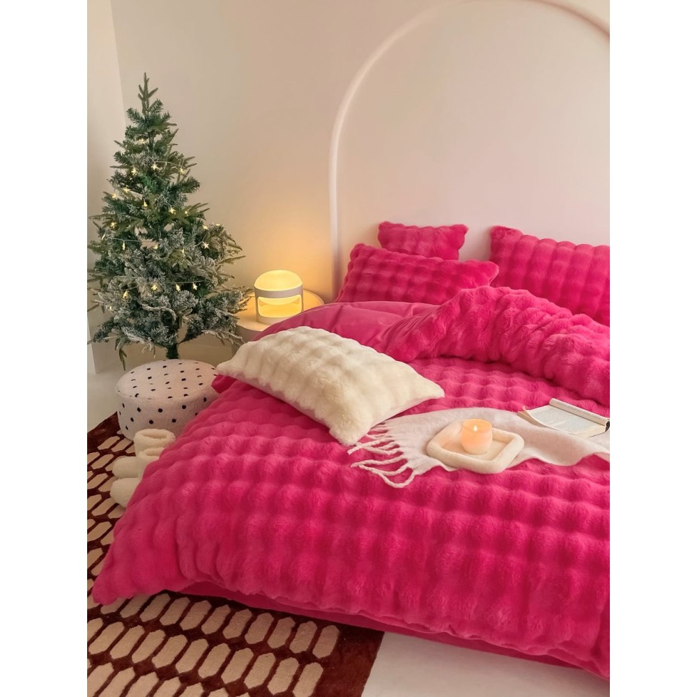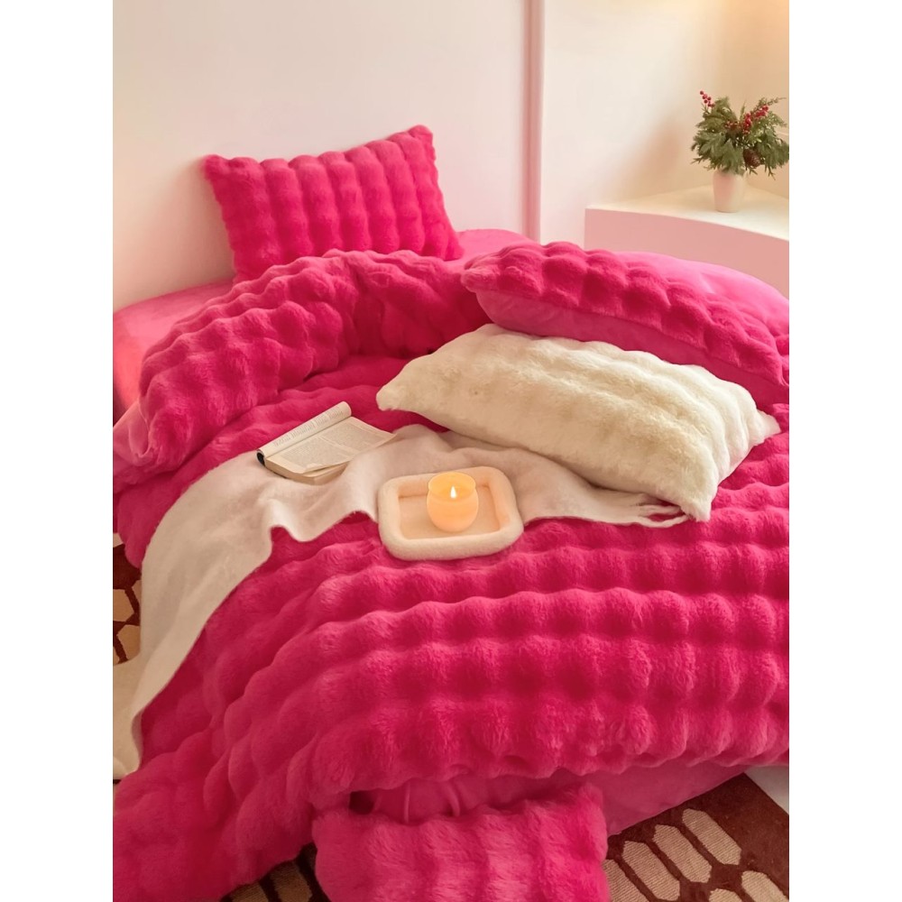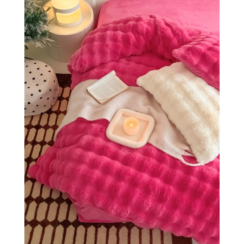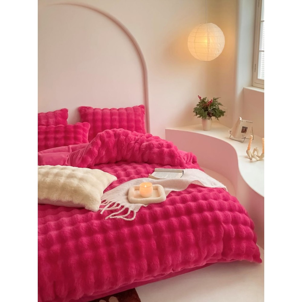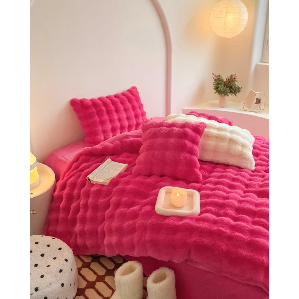 Lenjerie de Pat Dublu, ExtraPufoasa din Blăniță Artificială de Iepure, 4 piese, Fuchsya – Confort Premium și Eleganță Absolută, Casa Creativ Elegant Pucioasa, cod produs: BCC-BY-05