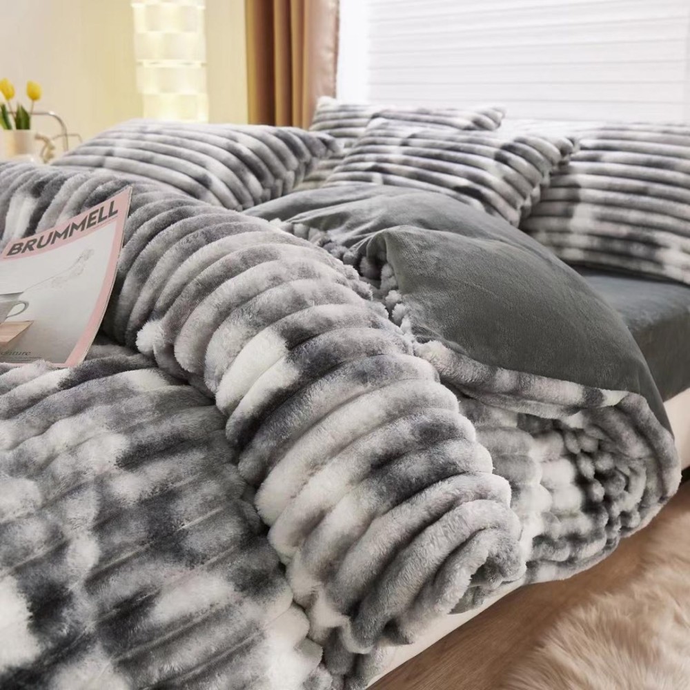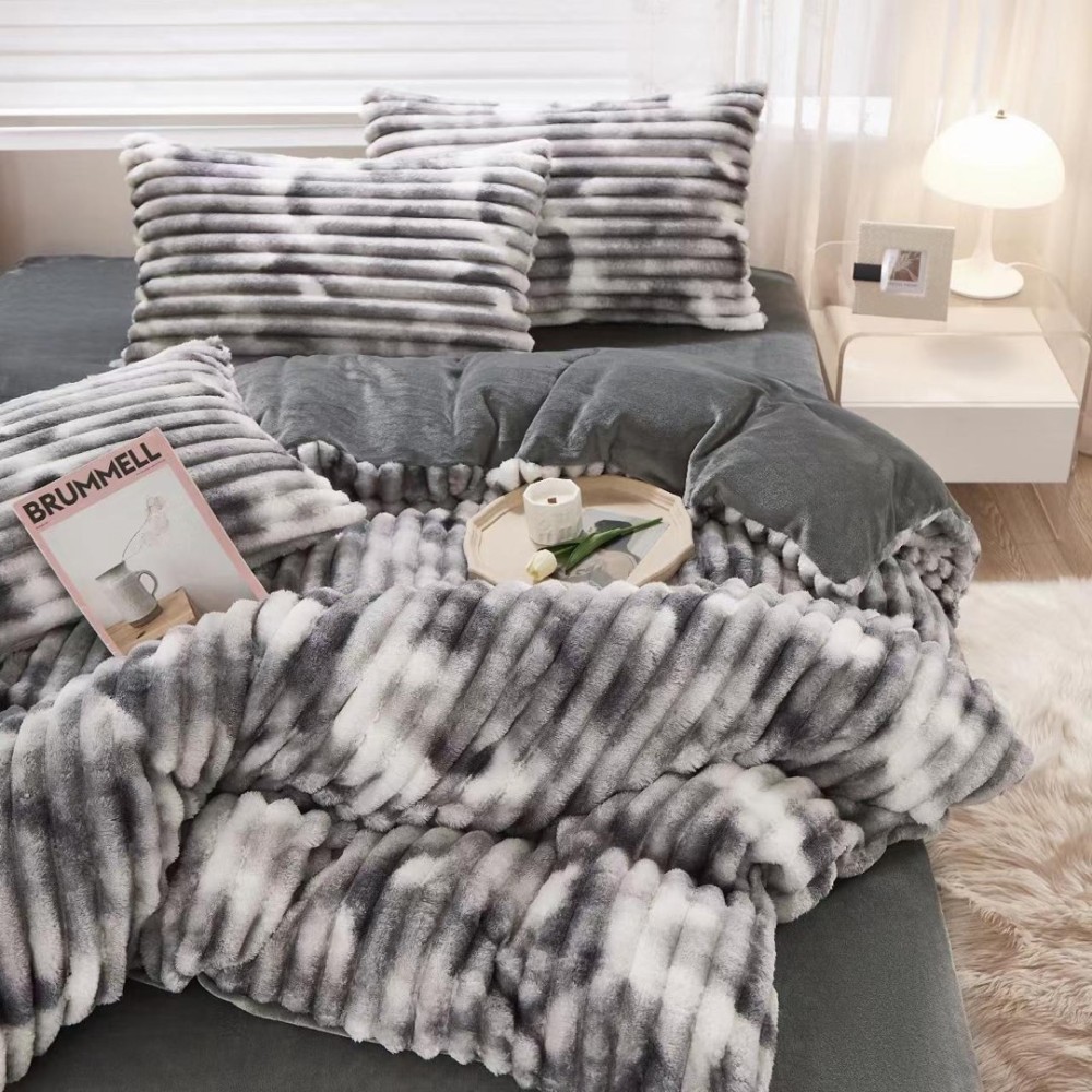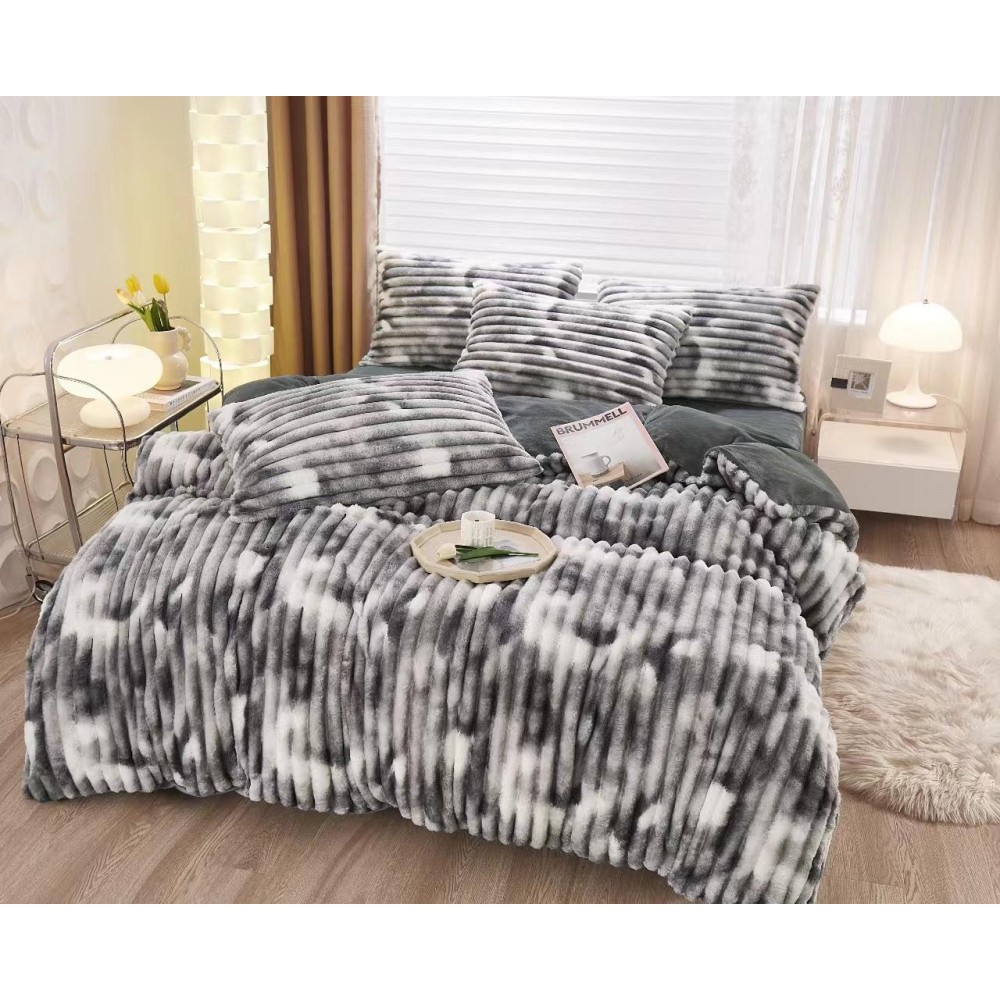 Lenjerie pat dublu, ExtraPufoasa, din Blanita artificiala de Iepure Gofrata, 4 piese, Alb-Gri, degrade, JOJO Home, cod produs: YAB1