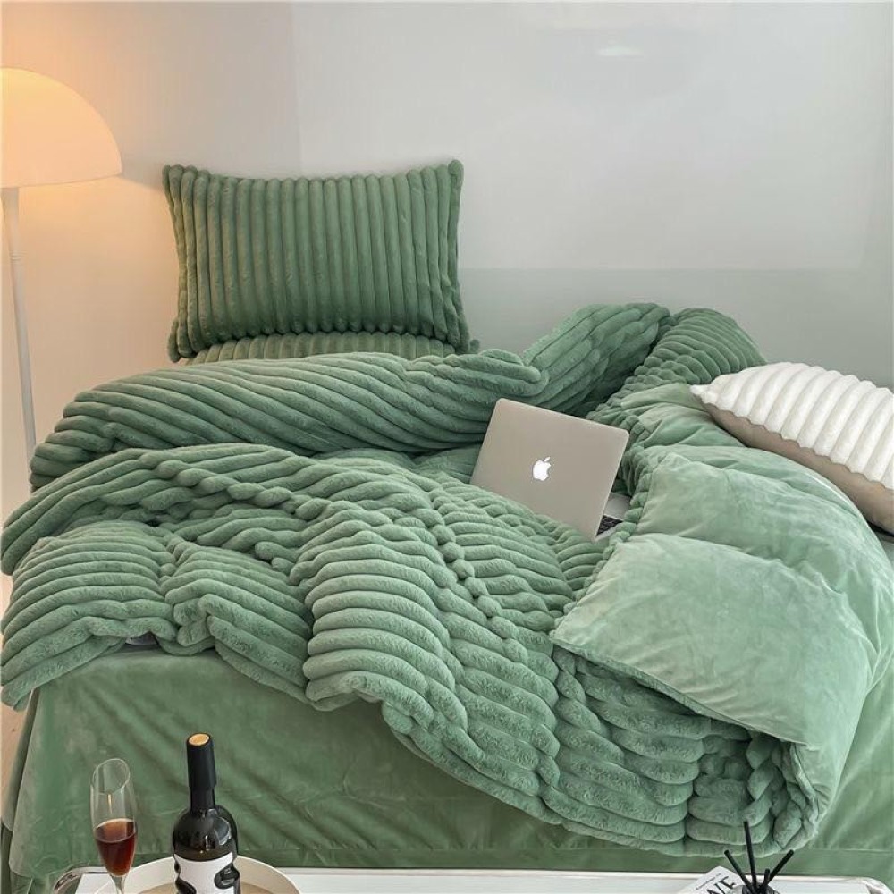 Lenjerie pat dublu, ExtraPufoasa, din Blanita artificiala de Iepure Gofrata, 4 piese, Verde, JOJO Home, cod produs: YAB10