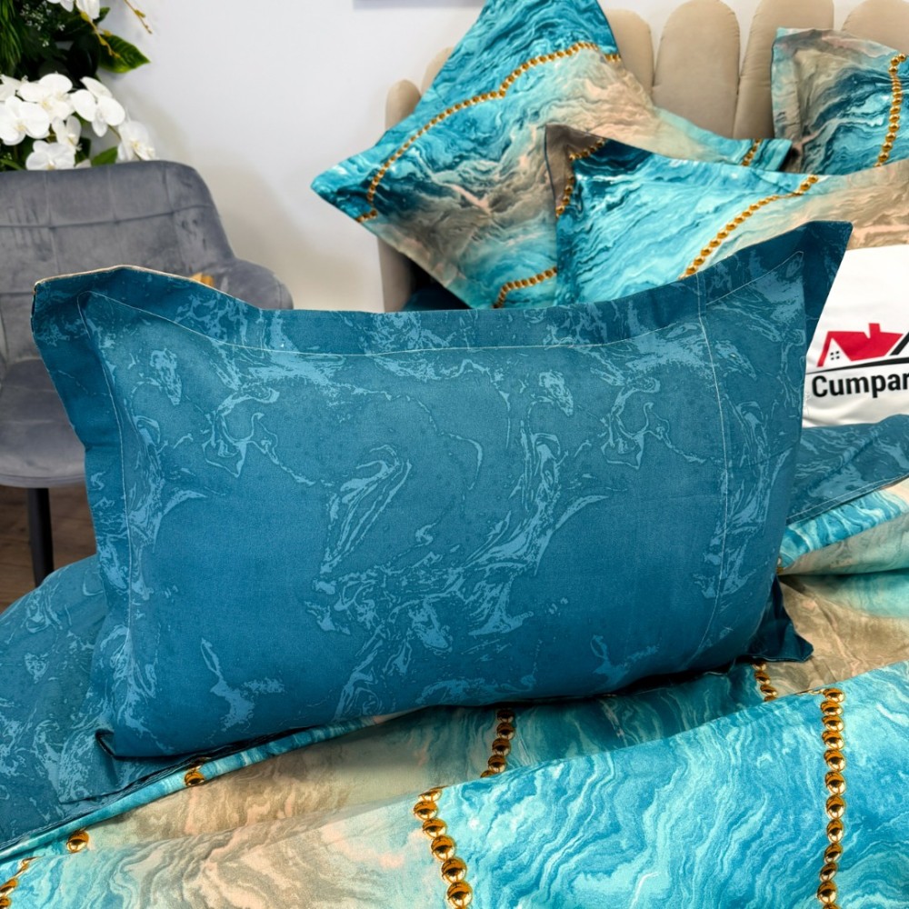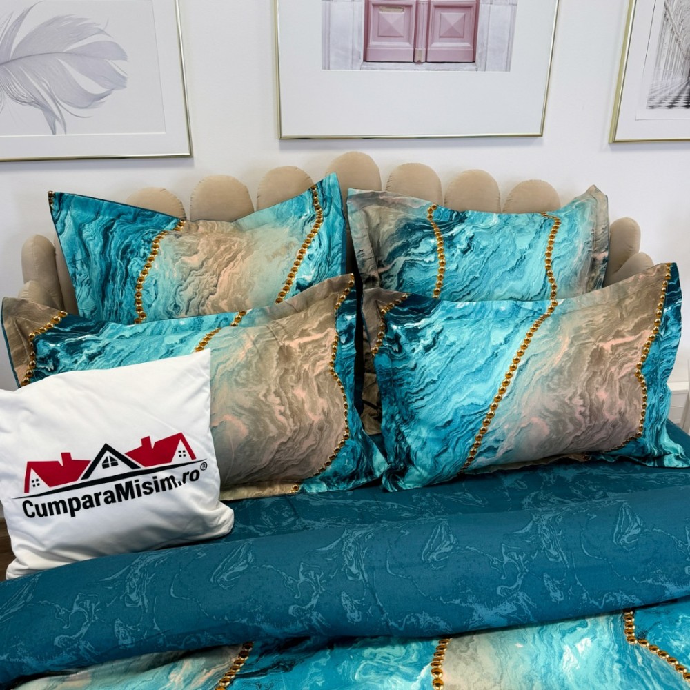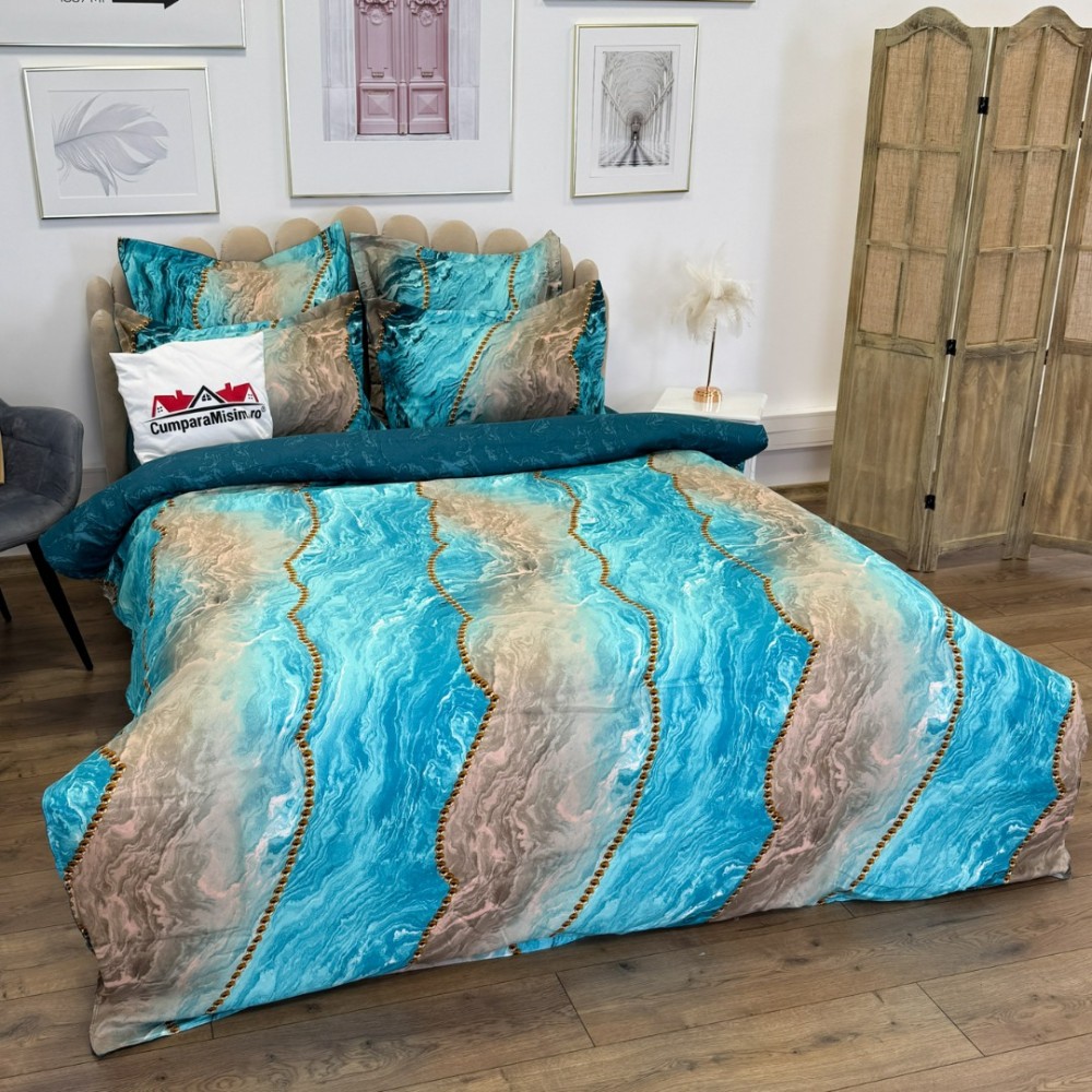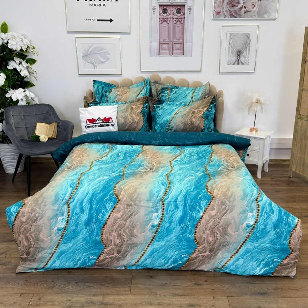 Lenjerie pat dublu, FINET, 6 piese, Albastru Aqua, valuri abstracte, perle, Johny Home Pucioasa, cod produs: SPR-R60-583