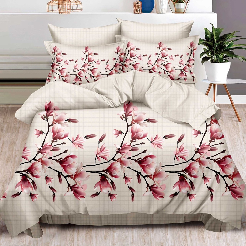 Lenjerie pat dublu, FINET, 6 piese, cu ELASTIC, Bej, magnolii, Johny Home Pucioasa, cod produs: SPR-T-290