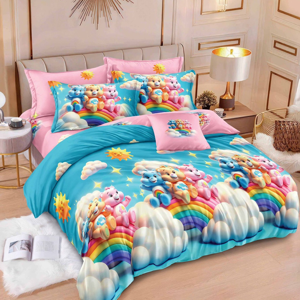 Lenjerie pat dublu, FINET, 6 piese, cu ELASTIC, Bleu, Roz, ursuleti, curcubeu, Johny Home Pucioasa, cod produs: SPR-T-298