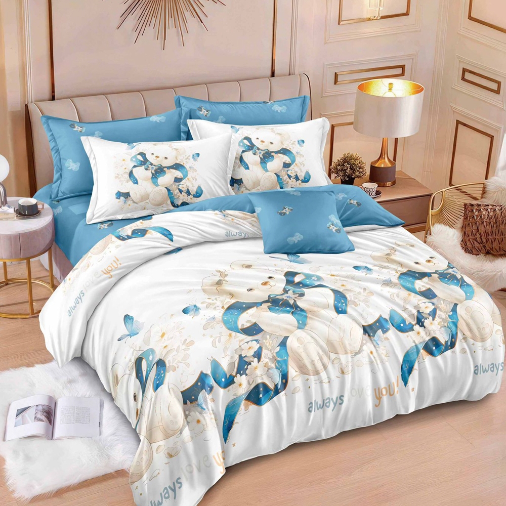 Lenjerie pat dublu, FINET, 6 piese, cu ELASTIC, Bleu, ursuleti, Johny Home Pucioasa, cod produs: SPR-T-297