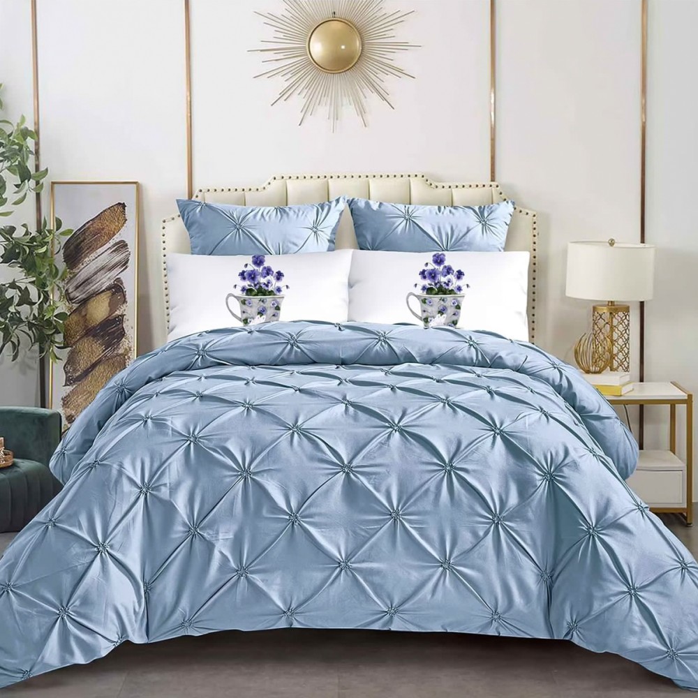 Lenjerie pat dublu, Finet Satinat Deluxe cu Pliuri Brodate, IDENTICA CU POZA, cu elastic, 6 piese, Bleu , Primavara Casa, cod produs: PRC200