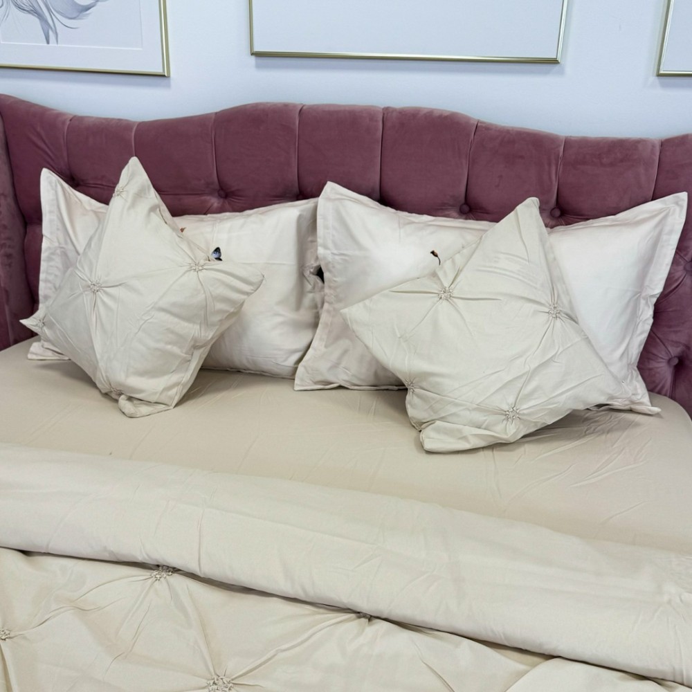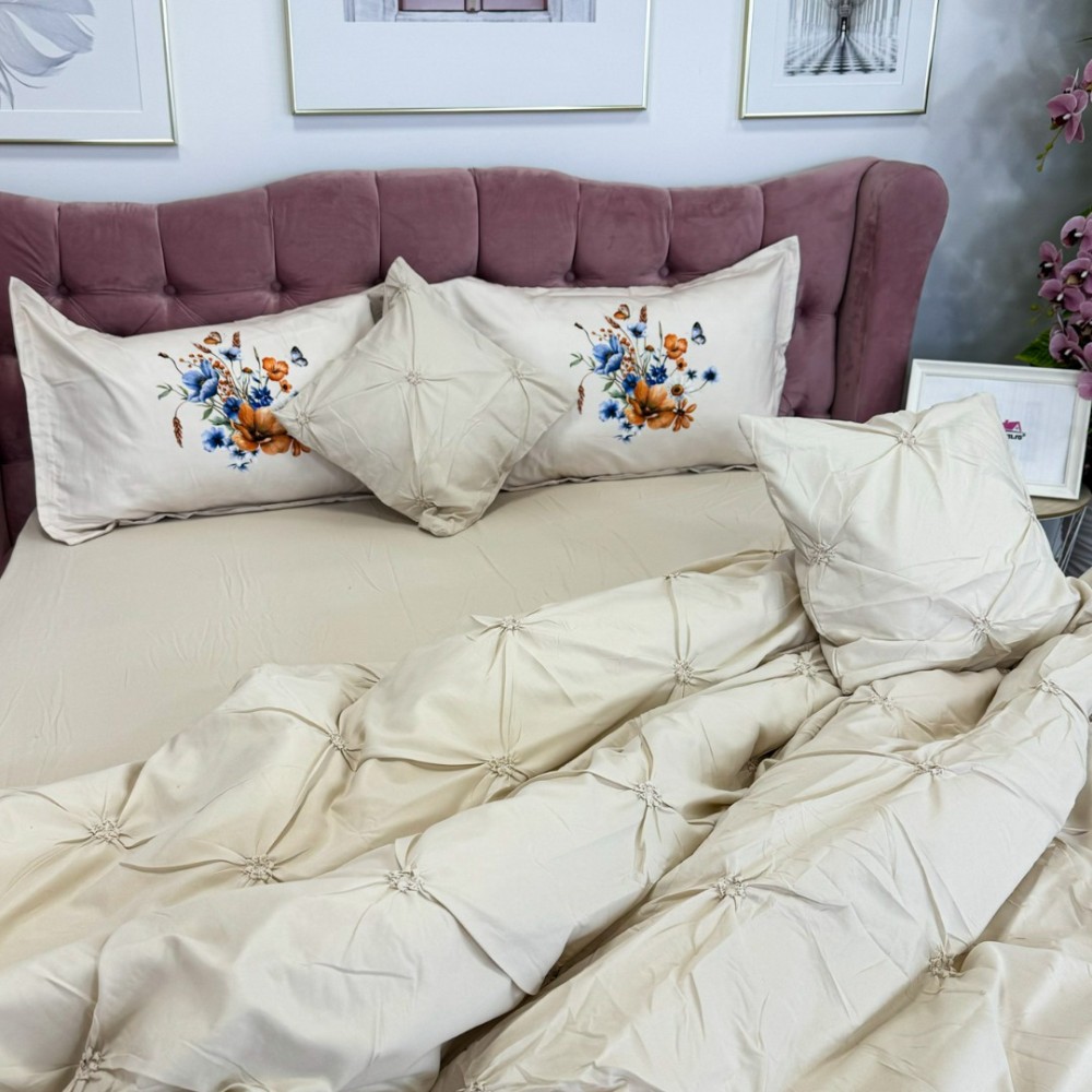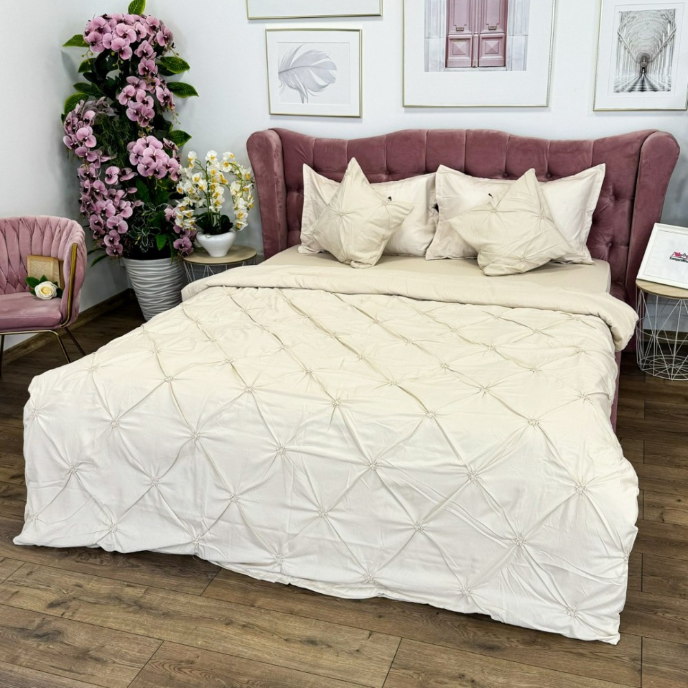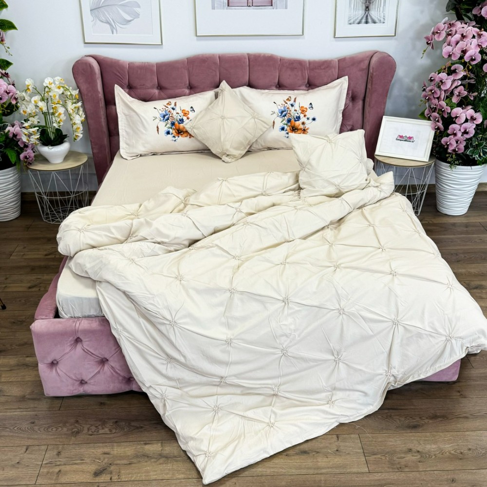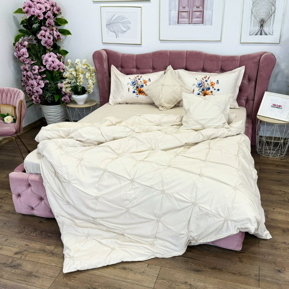 Lenjerie pat dublu, Finet Satinat Deluxe cu Pliuri Brodate, IDENTICA CU POZA, cu elastic, 6 piese, Crem, Primavara Casa, cod produs: PRM-NH-76