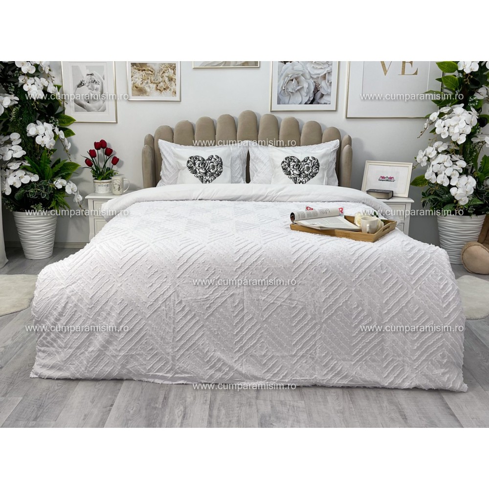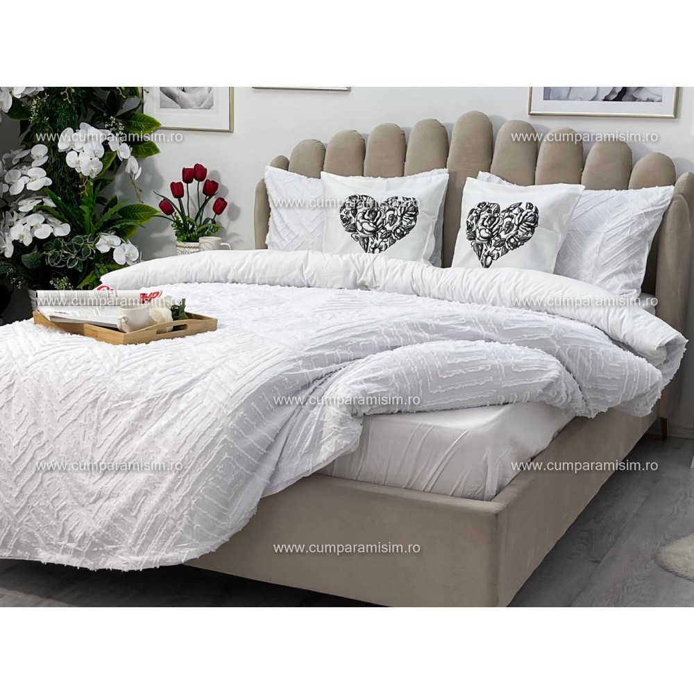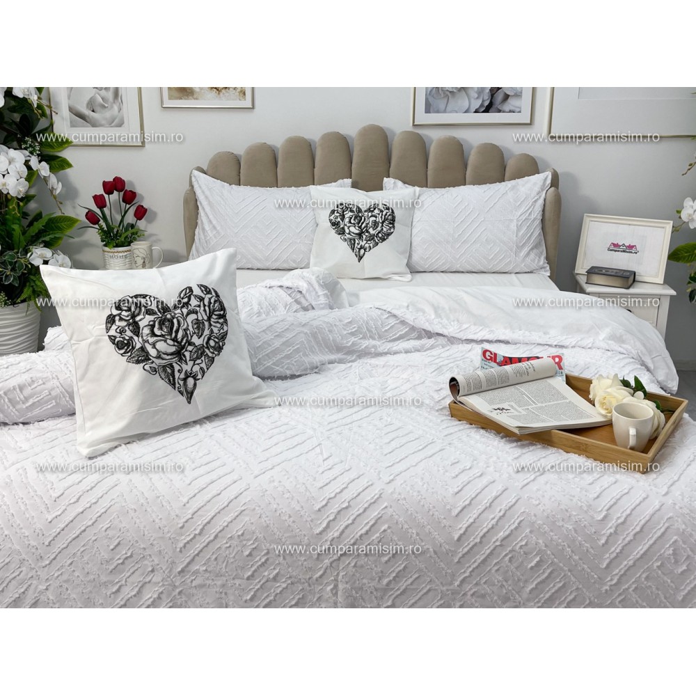 Lenjerie pat dublu, Finet Satinat Deluxe cu Smocuri Brodate, IDENTICA CU POZA, cu elastic, 4 anotimpuri, 6 piese, alb, Primavara Casa, cod produs: PRC100