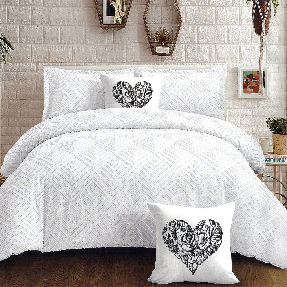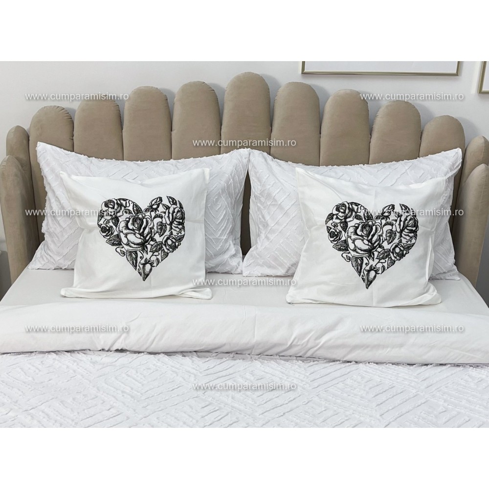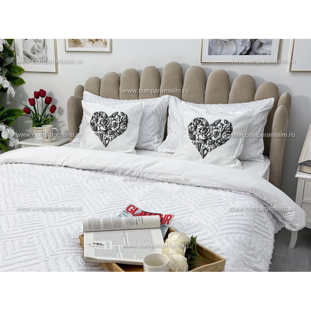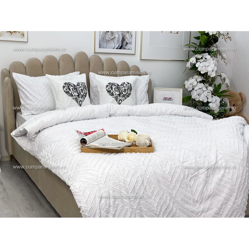 Lenjerie pat dublu, Finet Satinat Deluxe cu Smocuri Brodate, IDENTICA CU POZA, cu elastic, 4 anotimpuri, 6 piese, alb, Primavara Casa, cod produs: PRC100