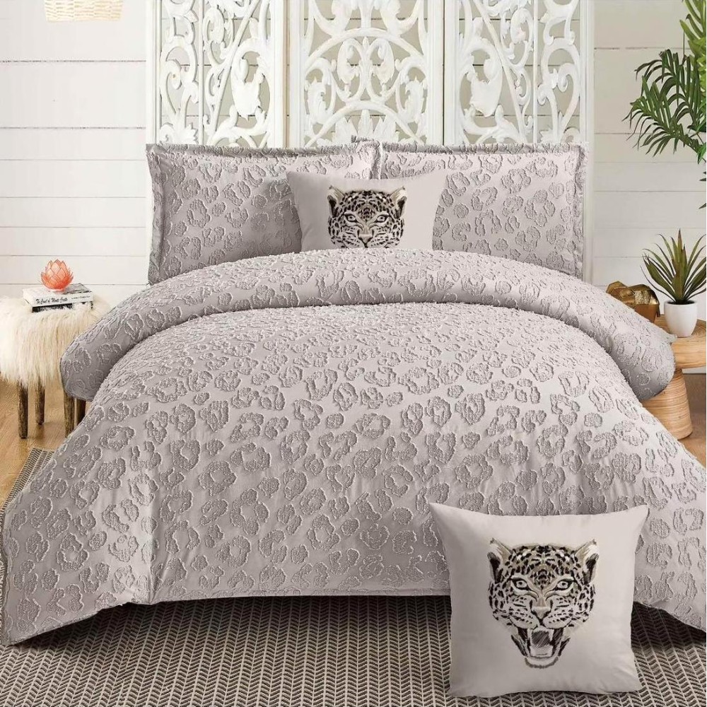 Lenjerie pat dublu, Finet Satinat Deluxe cu Smocuri Brodate, IDENTICA CU POZA, cu elastic, 4 anotimpuri, 6 piese, animal print, grej, Primavara Casa, cod produs: PRC304