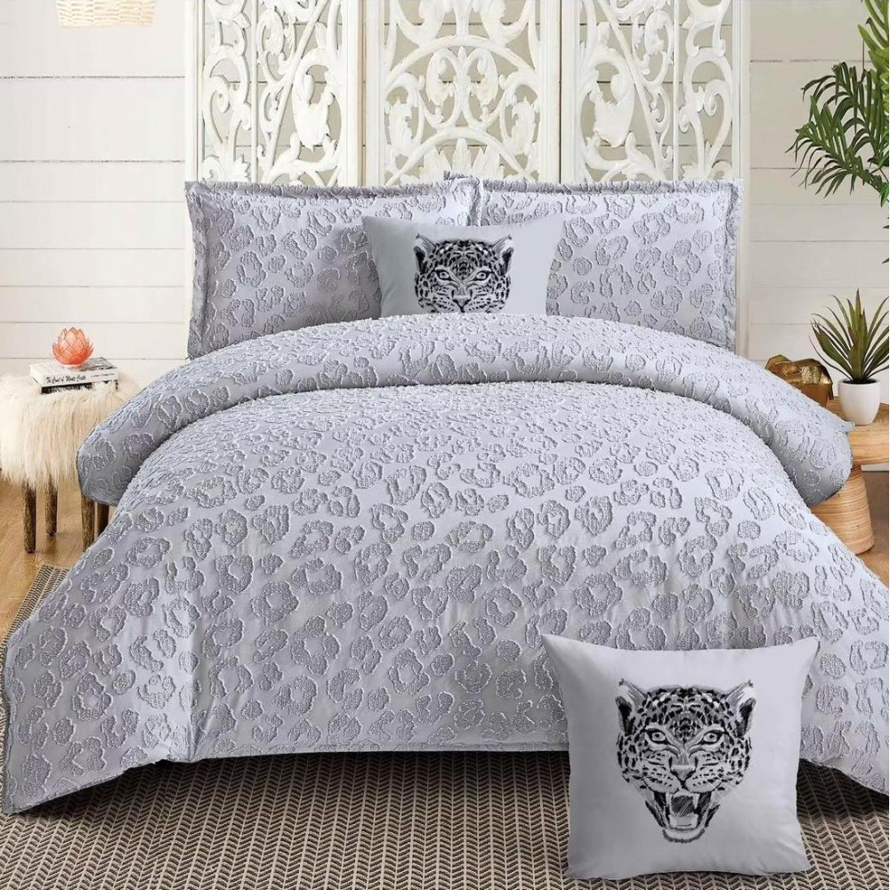 Lenjerie pat dublu, Finet Satinat Deluxe cu Smocuri Brodate, IDENTICA CU POZA, cu elastic, 4 anotimpuri, 6 piese, animal print, gri deschis, Primavara Casa, cod produs: PRC305