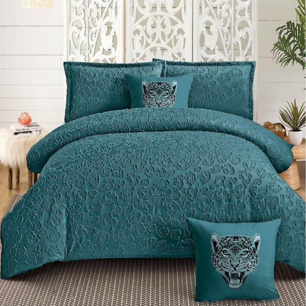 Lenjerie pat dublu, Finet Satinat Deluxe cu Smocuri Brodate, IDENTICA CU POZA, cu elastic, 4 anotimpuri, 6 piese, animal print, verde, Primavara Casa, cod produs: PRC308
