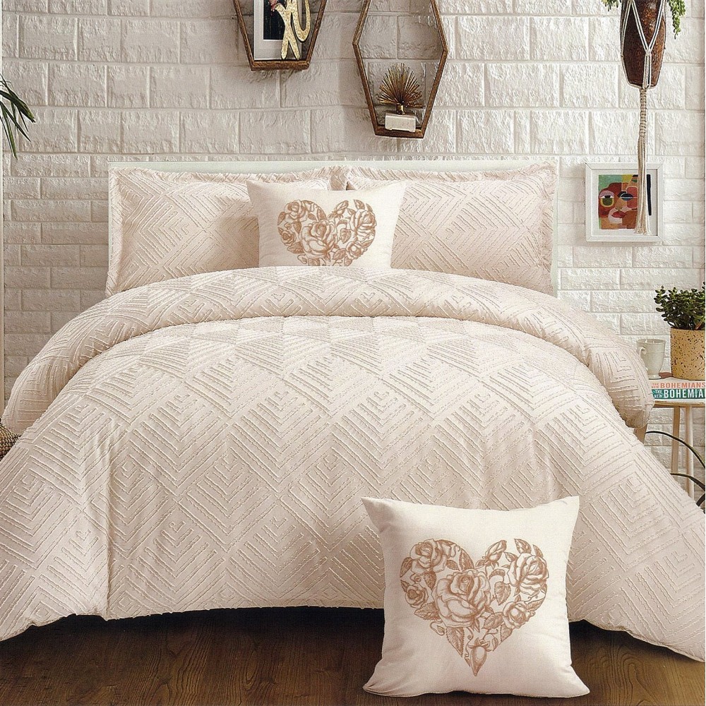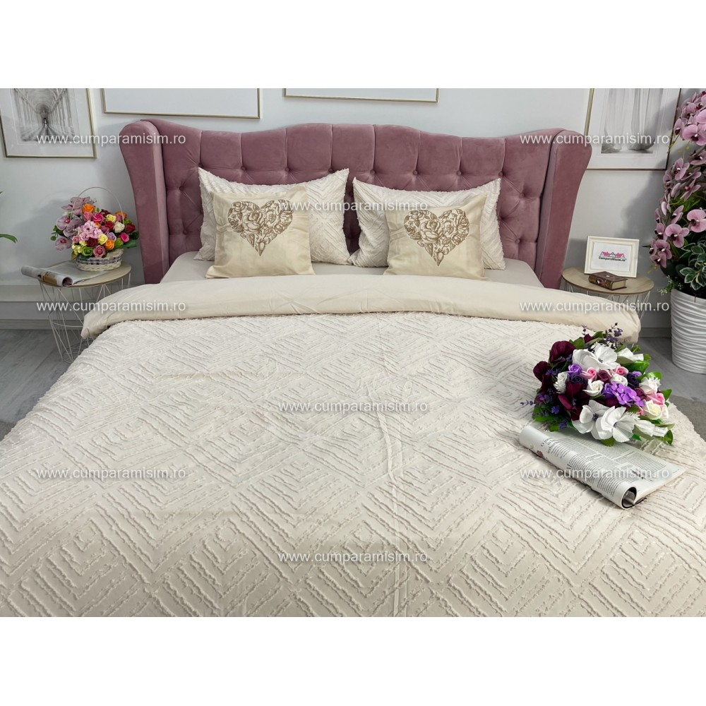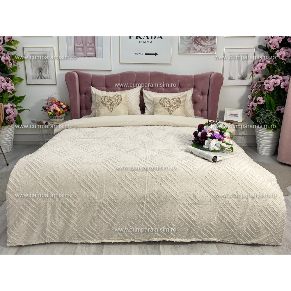 Lenjerie de pat dublu din finet satinat, 4 anotimpuri, cu smocuri brodate (tesatura din fabrica, ci nu imprimata, cu inaltime de 1 cm), confectionata din bumbac 100%, cu 6 piese. Materialul are un aspect lucios, cu smocuri brodate in relief, pentru o nota de eleganta si rafinament, facand astfel tesatura speciala atat prin calitate cat si prin design-ul sau unic.
