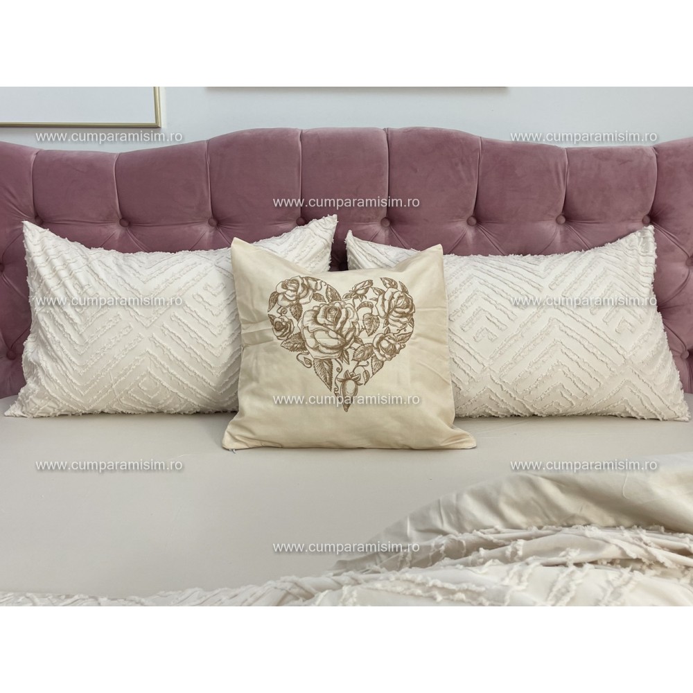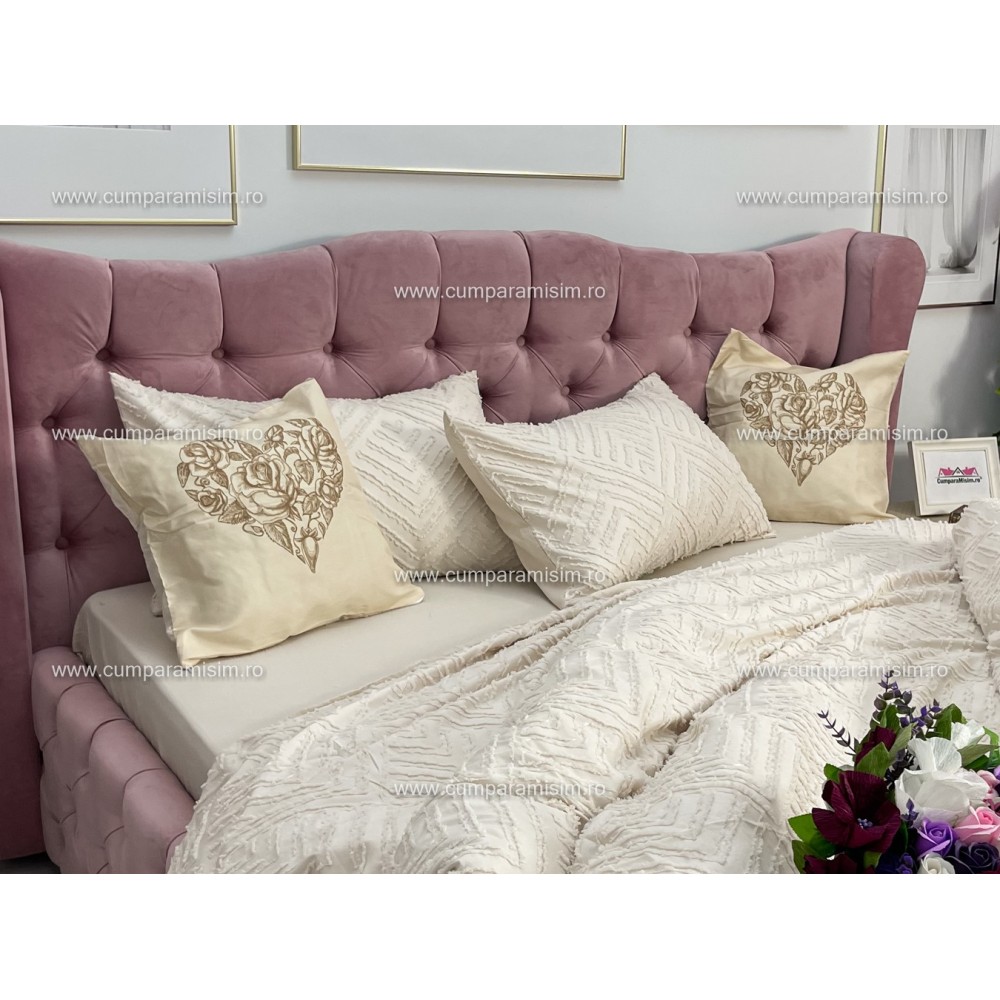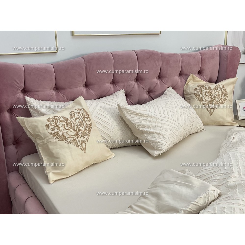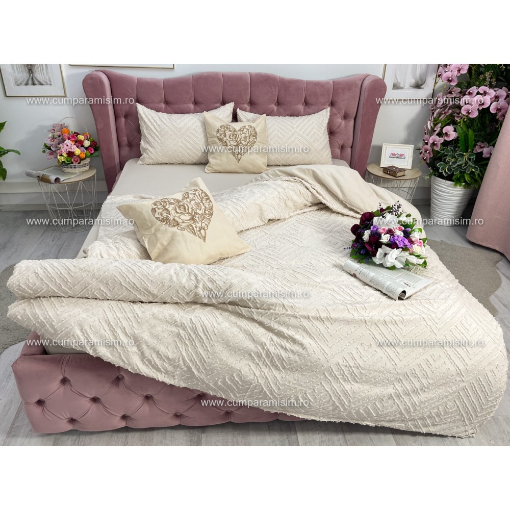 Lenjerie pat dublu, Finet Satinat Deluxe cu Smocuri Brodate, IDENTICA CU POZA, cu elastic, 4 anotimpuri, 6 piese, bej, Primavara Casa, cod produs: PRC106