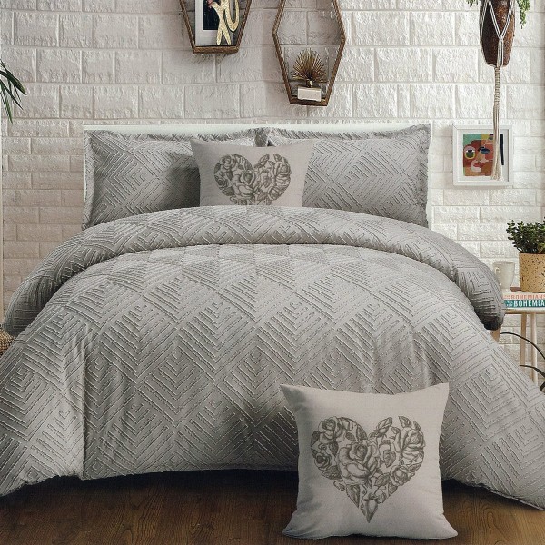 Lenjerie de pat dublu din finet satinat, 4 anotimpuri, cu smocuri brodate (tesatura din fabrica, ci nu imprimata, cu inaltime de 1 cm), confectionata din bumbac 100%, cu 6 piese. Materialul are un aspect lucios, cu smocuri brodate in relief, pentru o nota de eleganta si rafinament, facand astfel tesatura speciala atat prin calitate cat si prin design-ul sau unic.