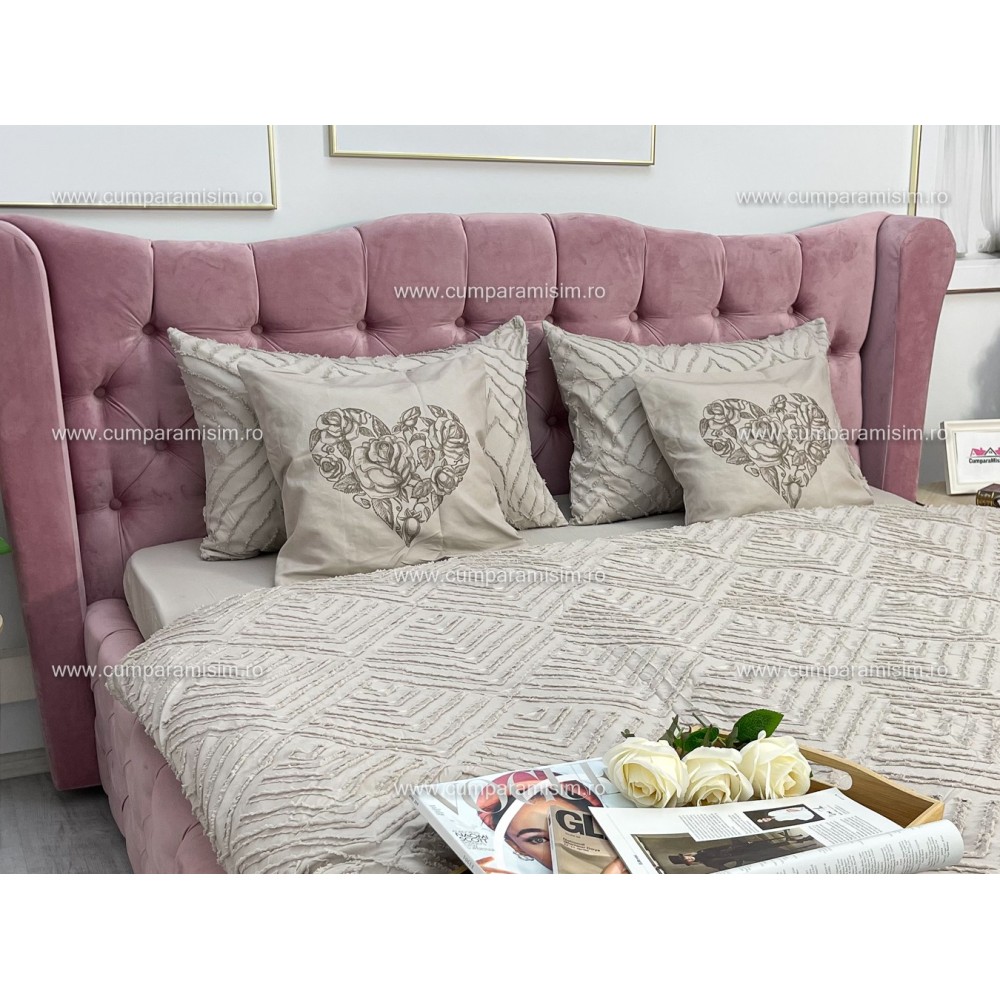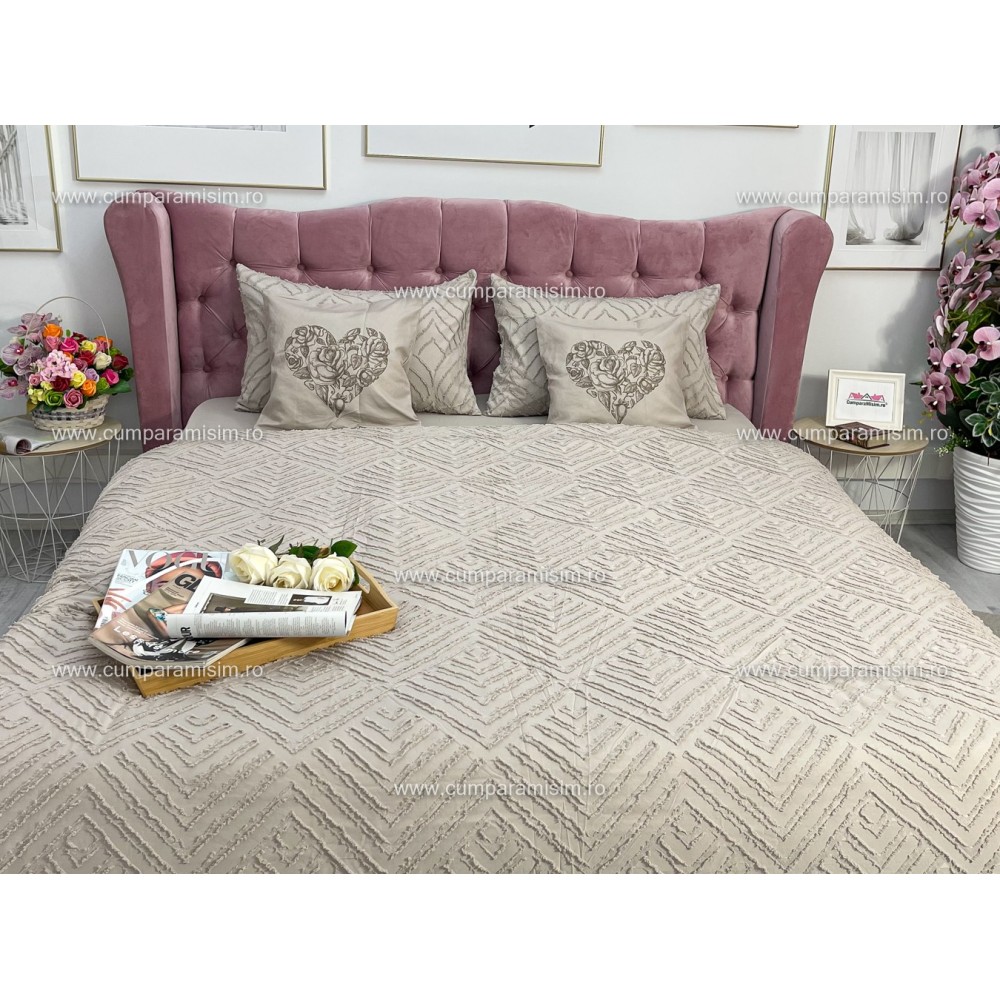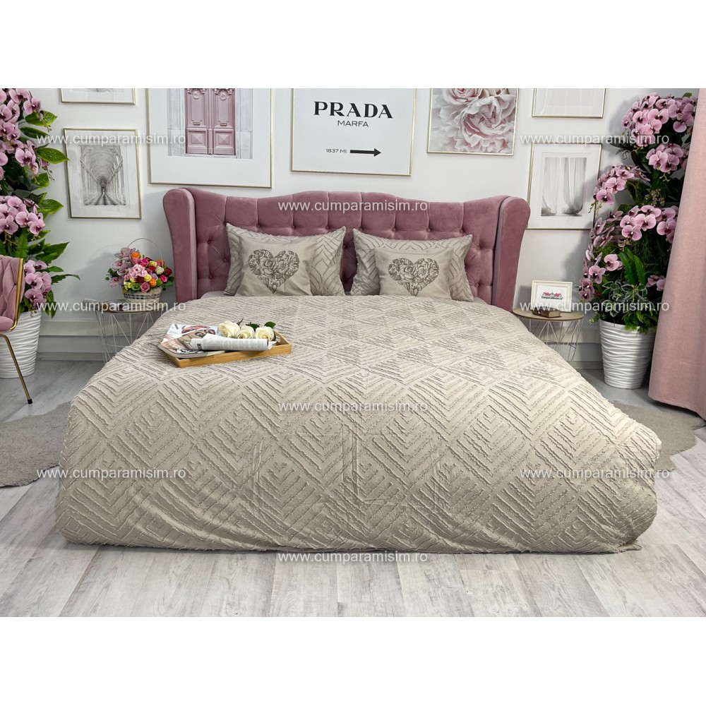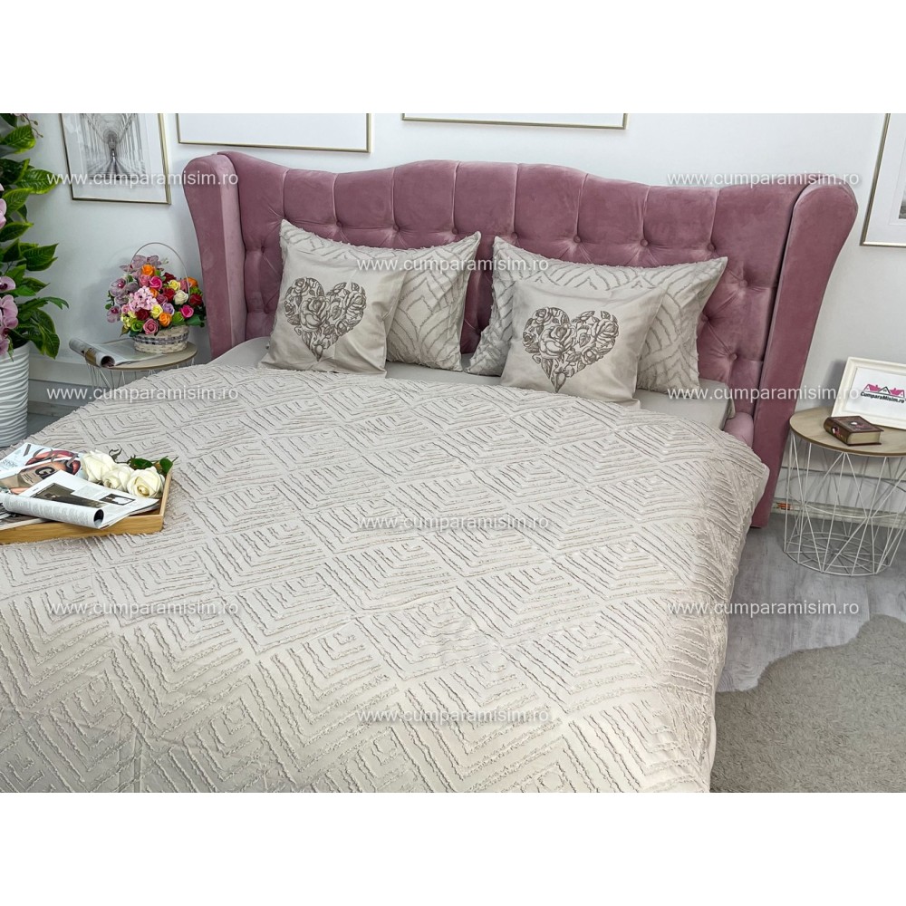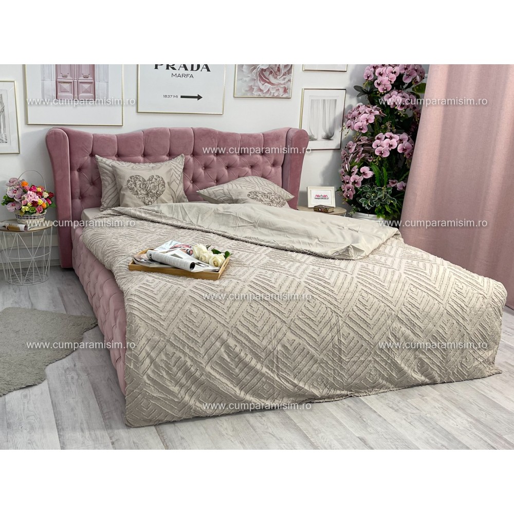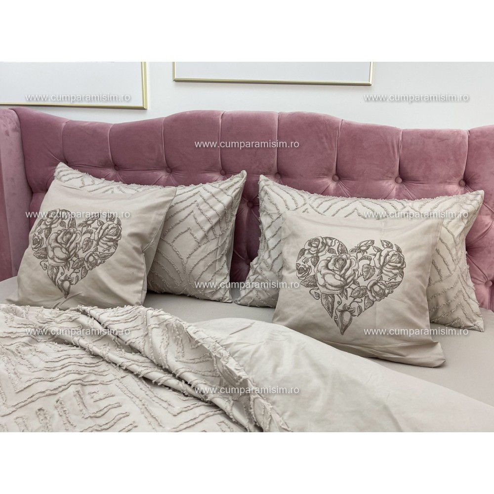 Lenjerie pat dublu, Finet Satinat Deluxe cu Smocuri Brodate, IDENTICA CU POZA, cu elastic, 4 anotimpuri, 6 piese, grej, Primavara Casa, cod produs: PRC103
