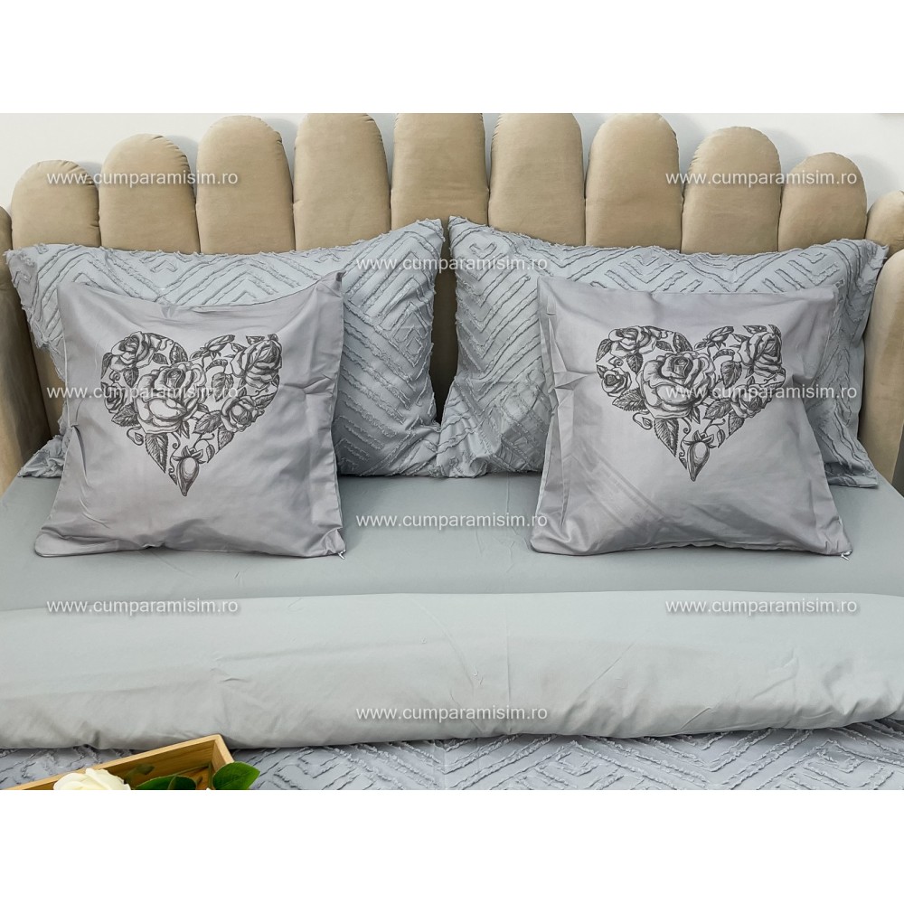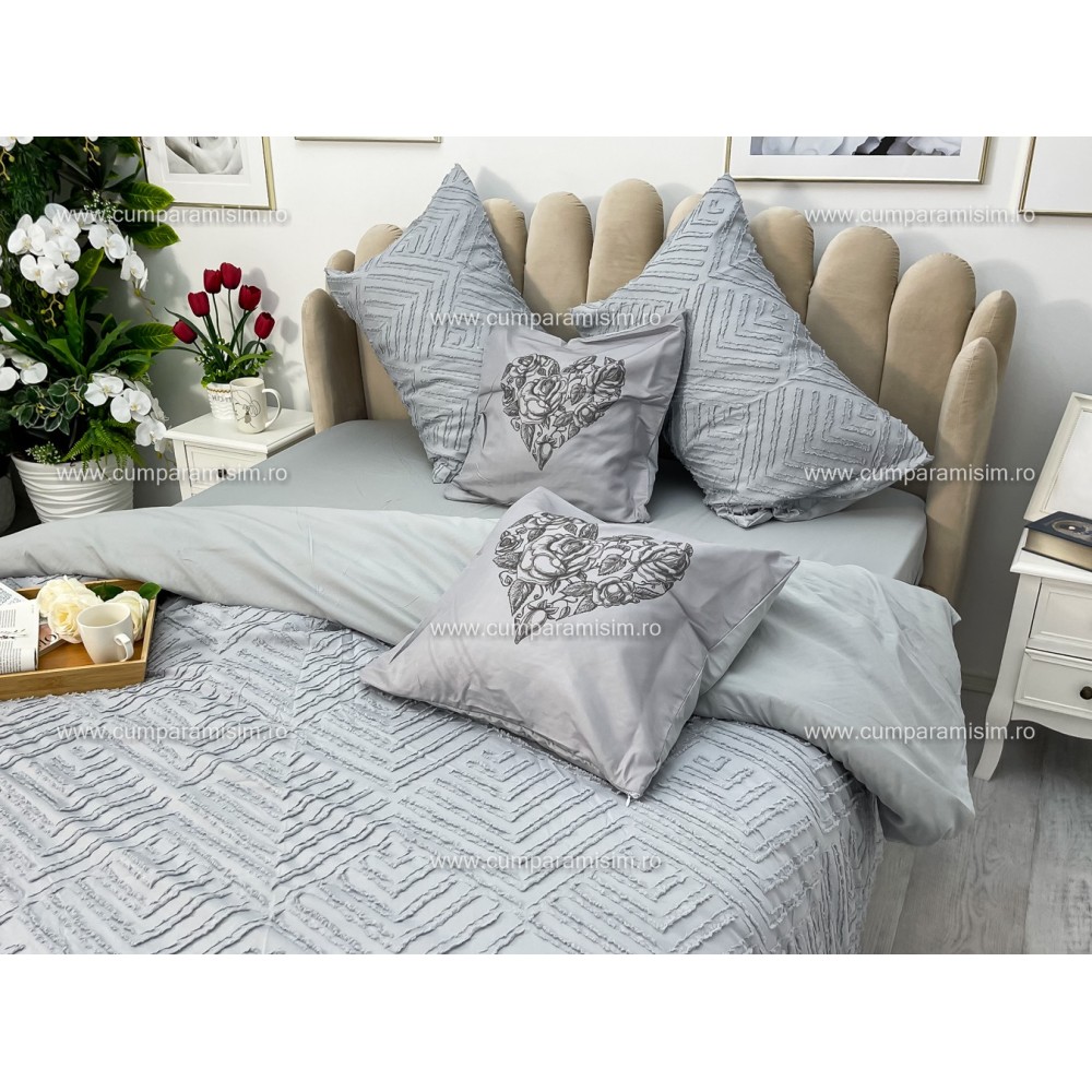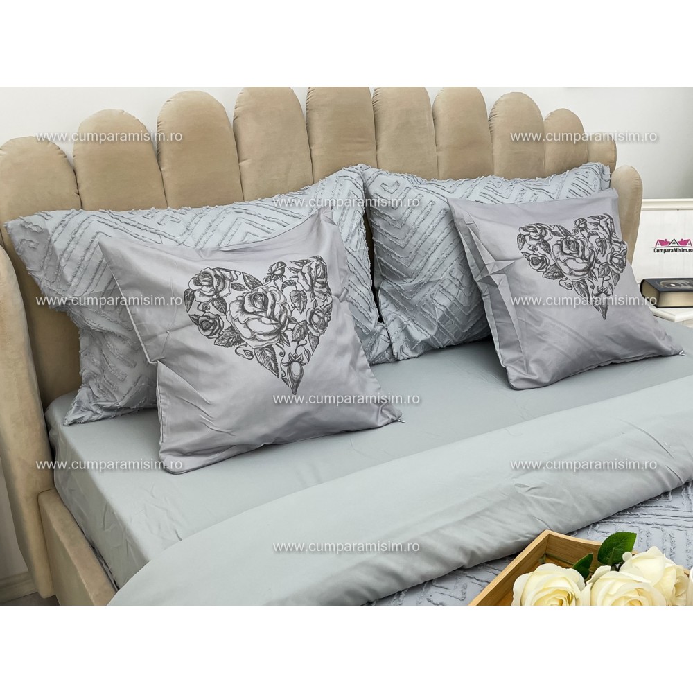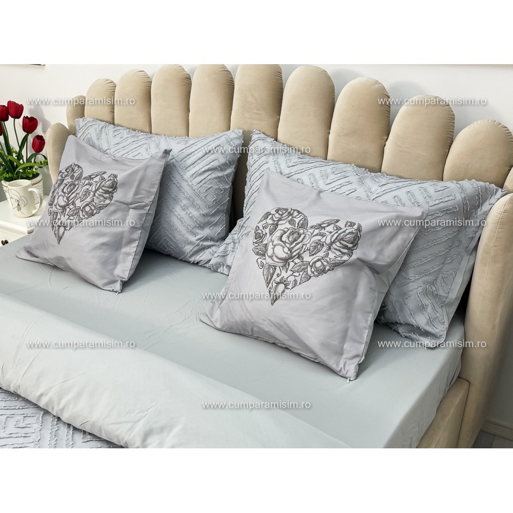 Lenjerie pat dublu, Finet Satinat Deluxe cu Smocuri Brodate, IDENTICA CU POZA, cu elastic, 4 anotimpuri, 6 piese, gri deschis, Primavara Casa, cod produs: PRC101