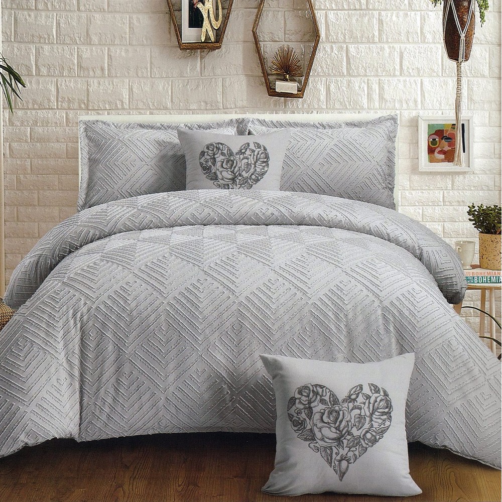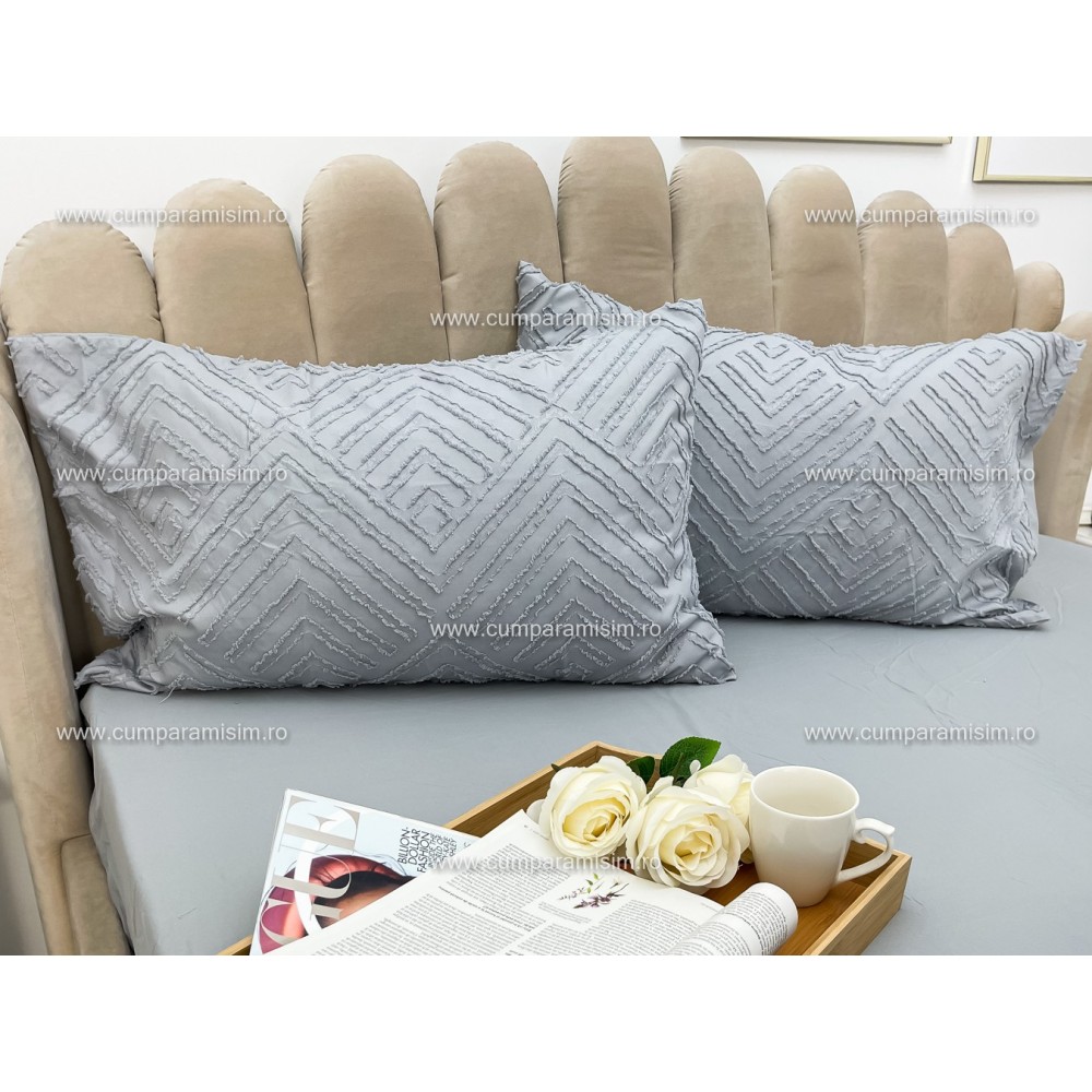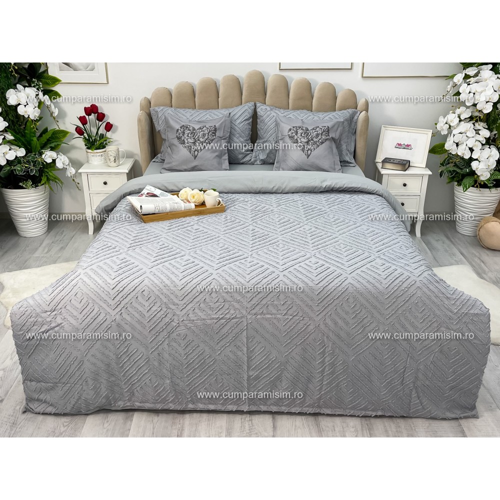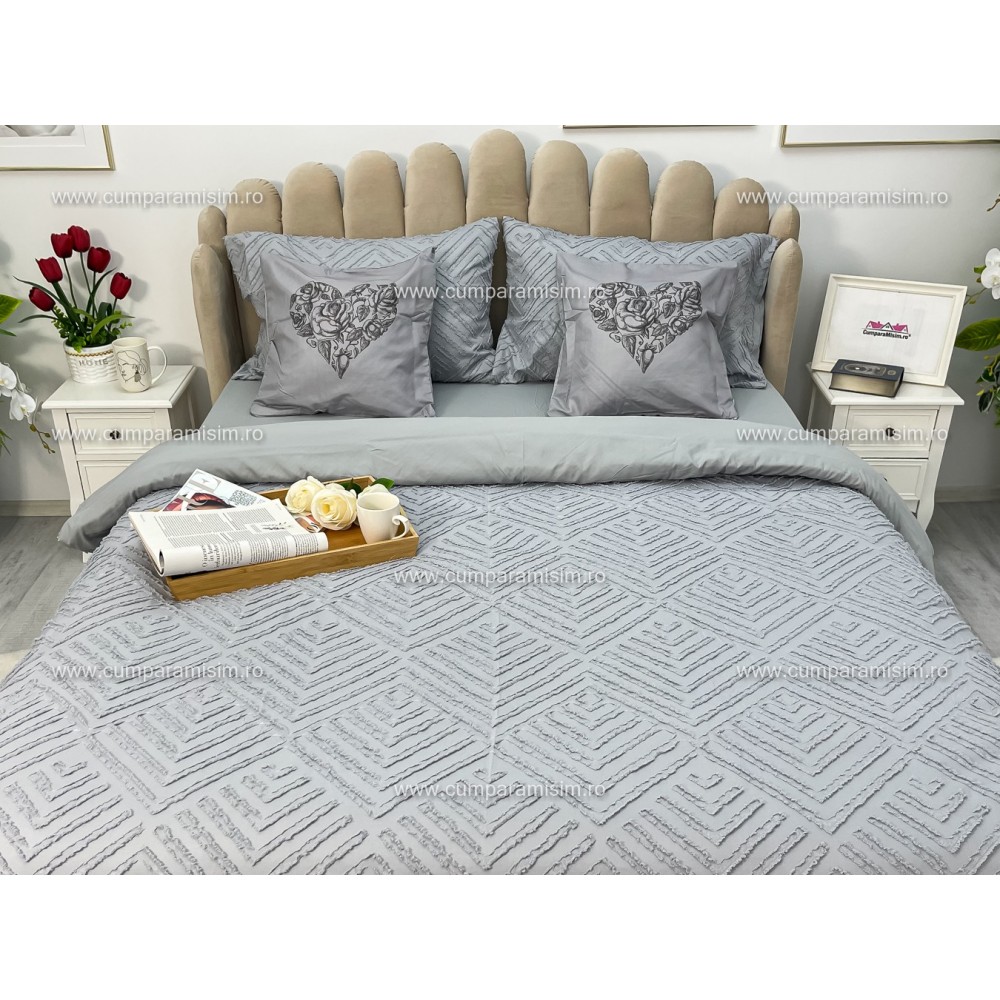 Lenjerie pat dublu, Finet Satinat Deluxe cu Smocuri Brodate, IDENTICA CU POZA, cu elastic, 4 anotimpuri, 6 piese, gri deschis, Primavara Casa, cod produs: PRC101