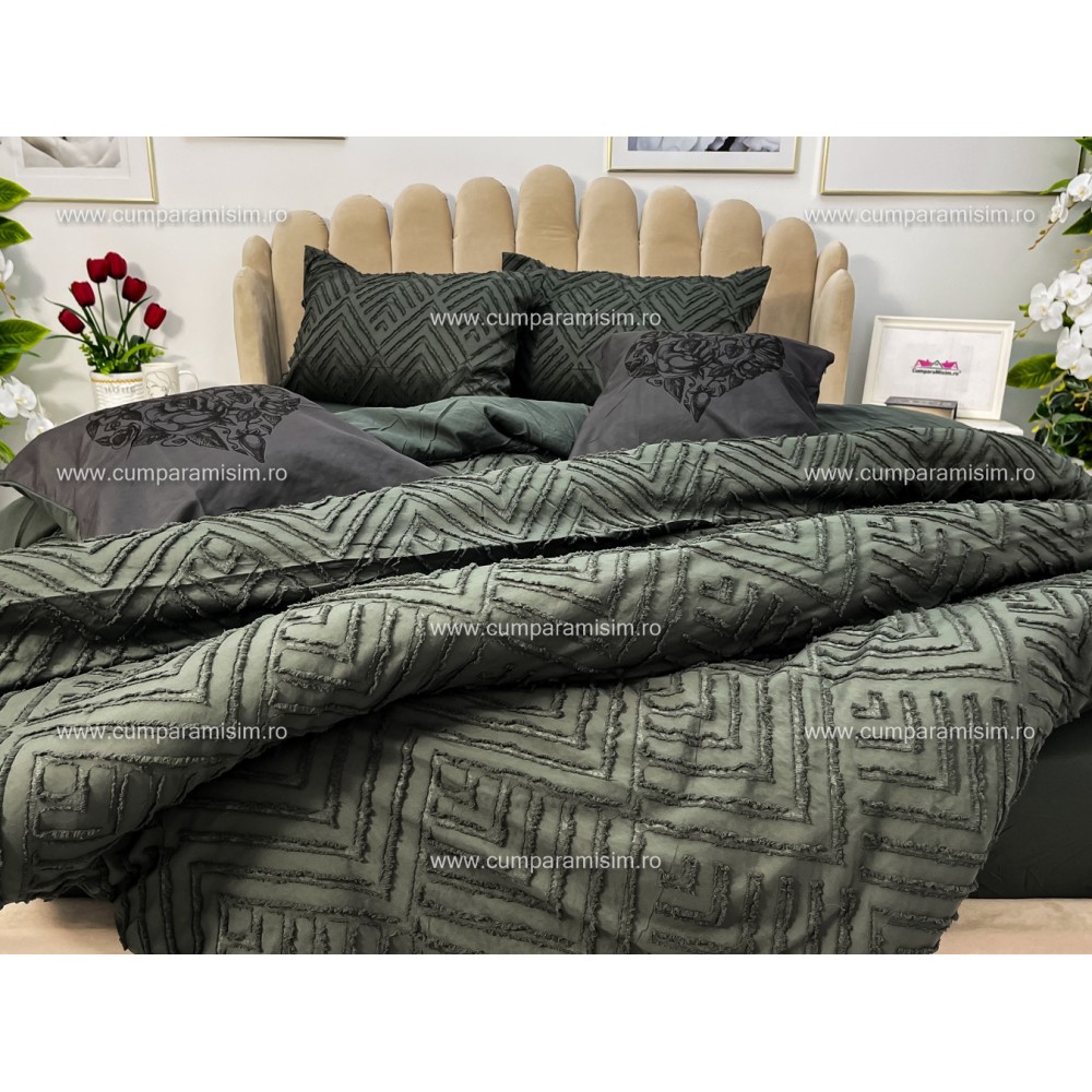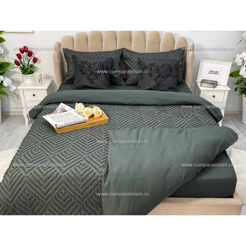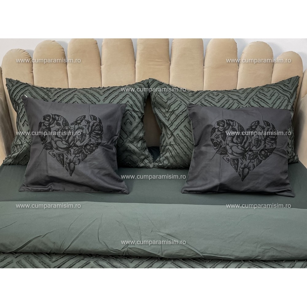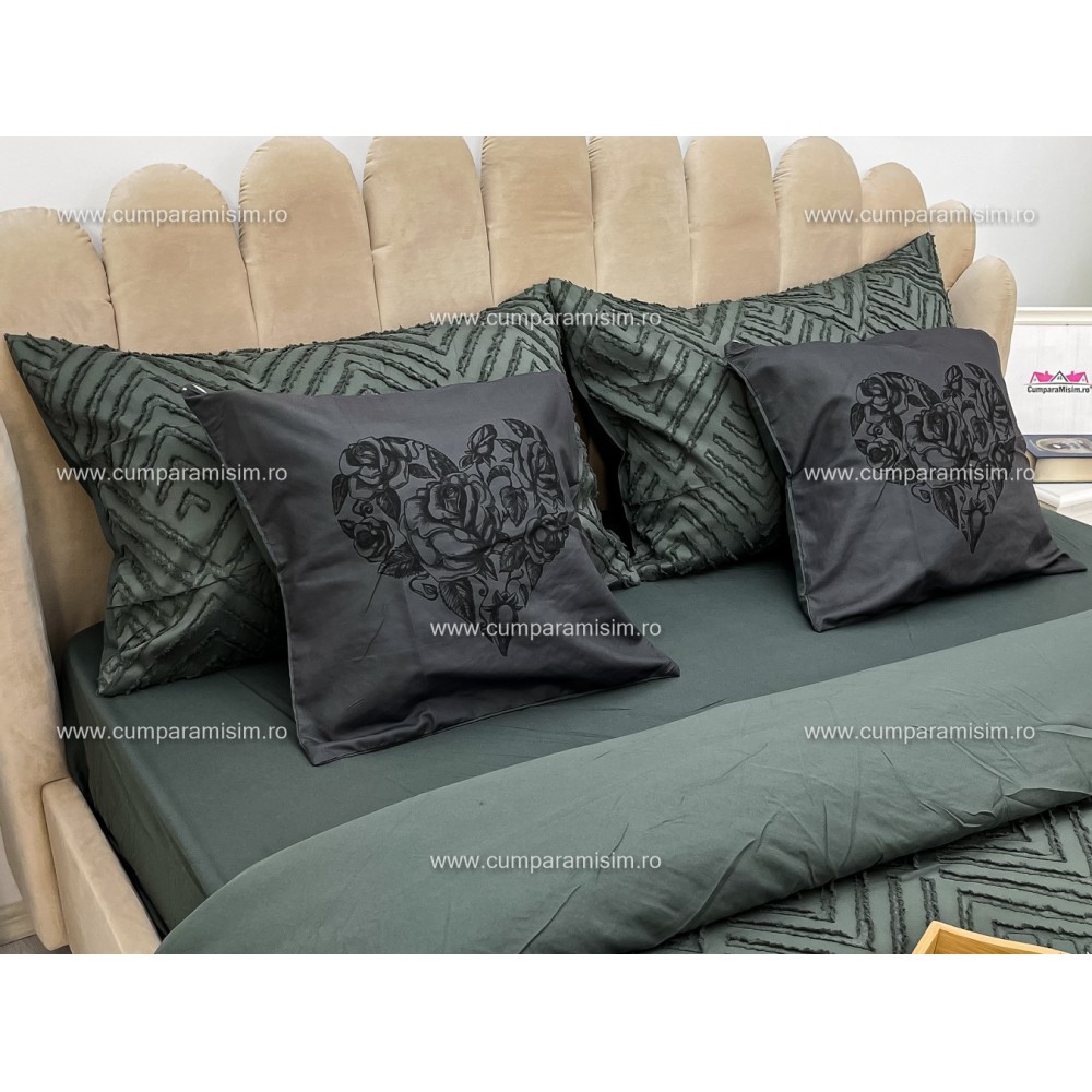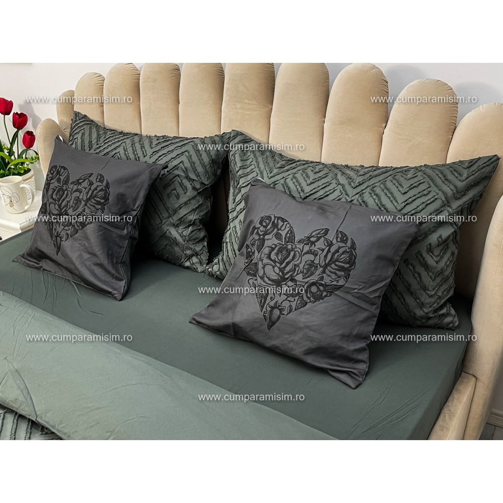 Lenjerie pat dublu, Finet Satinat Deluxe cu Smocuri Brodate, IDENTICA CU POZA, cu elastic, 4 anotimpuri, 6 piese, gri verzui, Primavara Casa, cod produs: PRC104