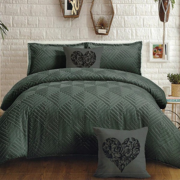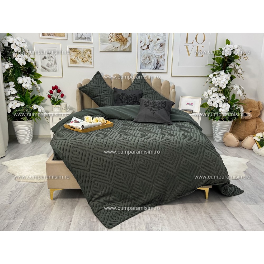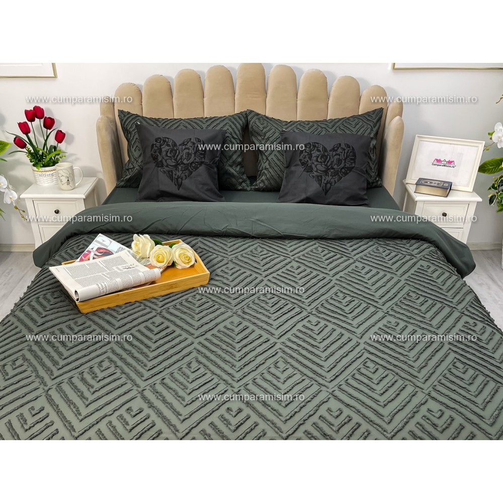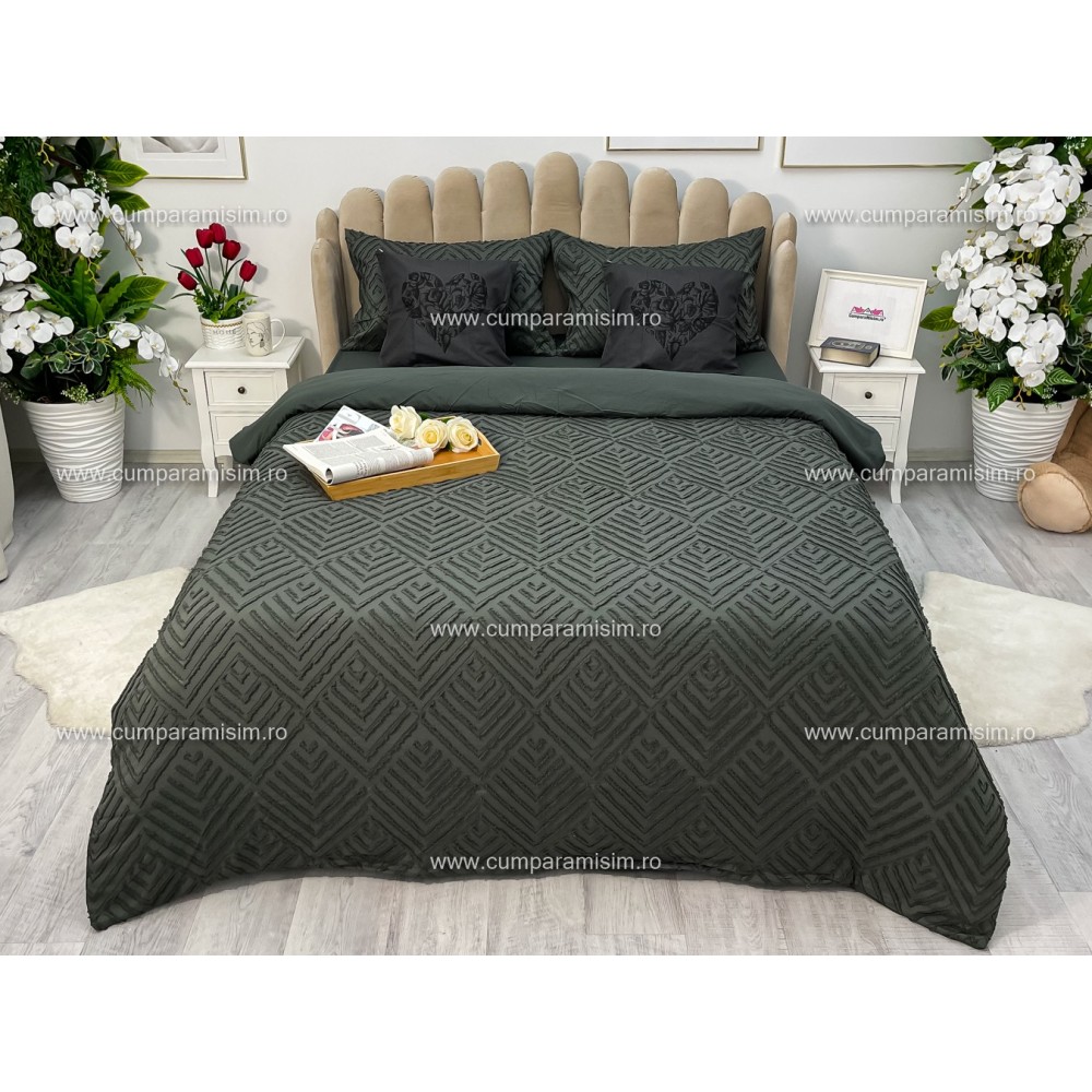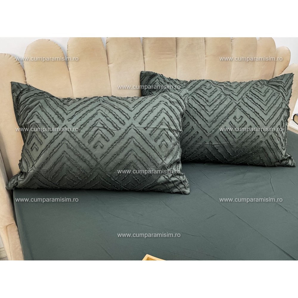 Lenjerie pat dublu, Finet Satinat Deluxe cu Smocuri Brodate, IDENTICA CU POZA, cu elastic, 4 anotimpuri, 6 piese, gri verzui, Primavara Casa, cod produs: PRC104