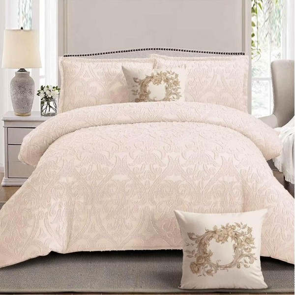 Lenjerie de pat dublu din finet satinat, 4 anotimpuri, cu smocuri brodate (tesatura din fabrica, ci nu imprimata, cu inaltime de 1 cm), confectionata din bumbac 100%, cu 6 piese. Materialul are un aspect lucios, cu smocuri brodate in relief, pentru o nota de eleganta si rafinament, facand astfel tesatura speciala atat prin calitate cat si prin design-ul sau unic.