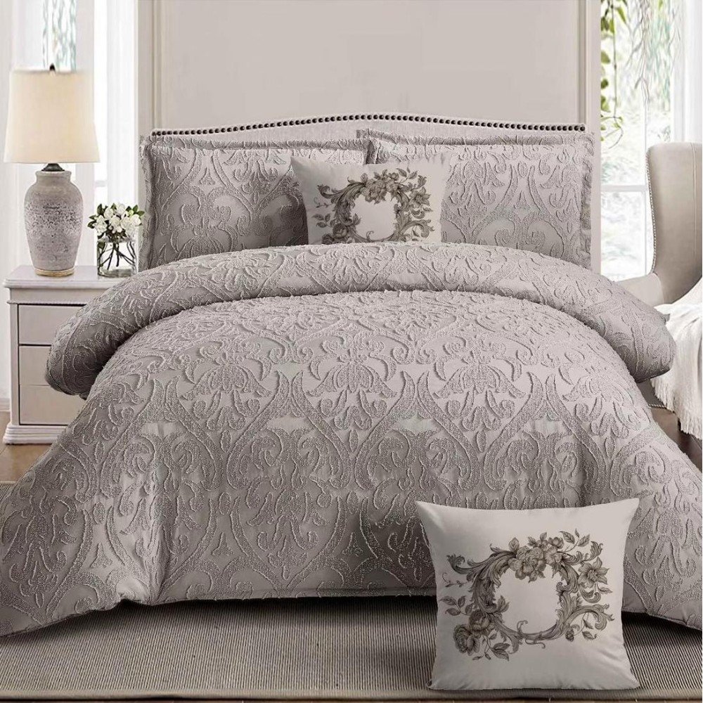 Lenjerie pat dublu, Finet Satinat Deluxe cu Smocuri Brodate, IDENTICA CU POZA, cu elastic, 4 anotimpuri, 6 piese, model oriental, grej, Primavara Casa, cod produs: PRC356