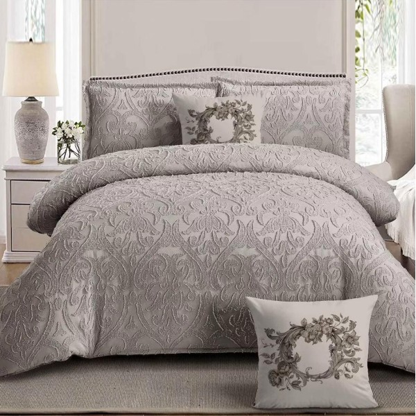 Lenjerie de pat dublu din finet satinat, 4 anotimpuri, cu smocuri brodate (tesatura din fabrica, ci nu imprimata, cu inaltime de 1 cm), confectionata din bumbac 100%, cu 6 piese. Materialul are un aspect lucios, cu smocuri brodate in relief, pentru o nota de eleganta si rafinament, facand astfel tesatura speciala atat prin calitate cat si prin design-ul sau unic.