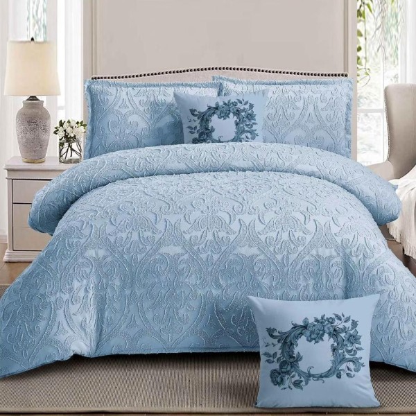 Lenjerie de pat dublu din finet satinat, 4 anotimpuri, cu smocuri brodate (tesatura din fabrica, ci nu imprimata, cu inaltime de 1 cm), confectionata din bumbac 100%, cu 6 piese. Materialul are un aspect lucios, cu smocuri brodate in relief, pentru o nota de eleganta si rafinament, facand astfel tesatura speciala atat prin calitate cat si prin design-ul sau unic.
