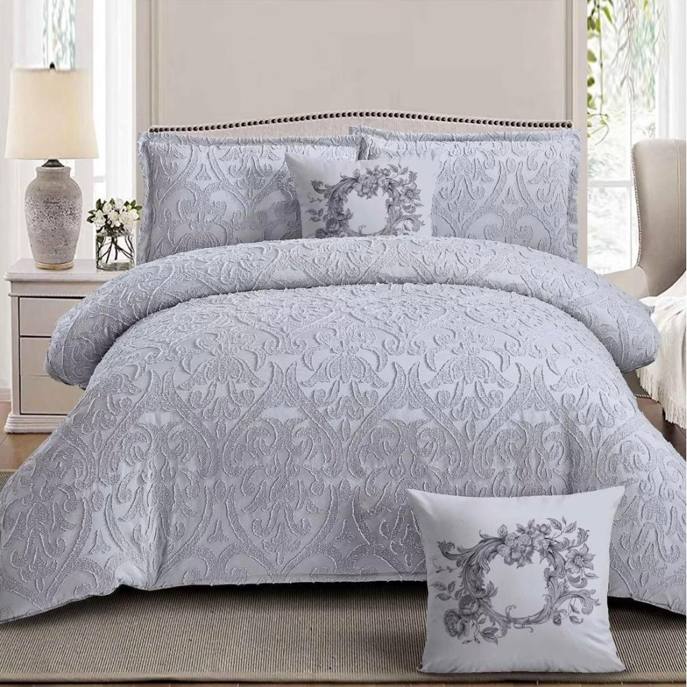 Lenjerie pat dublu, Finet Satinat Deluxe cu Smocuri Brodate, IDENTICA CU POZA, cu elastic, 4 anotimpuri, 6 piese, model oriental, gri deschis, Primavara Casa, cod produs: PRC353