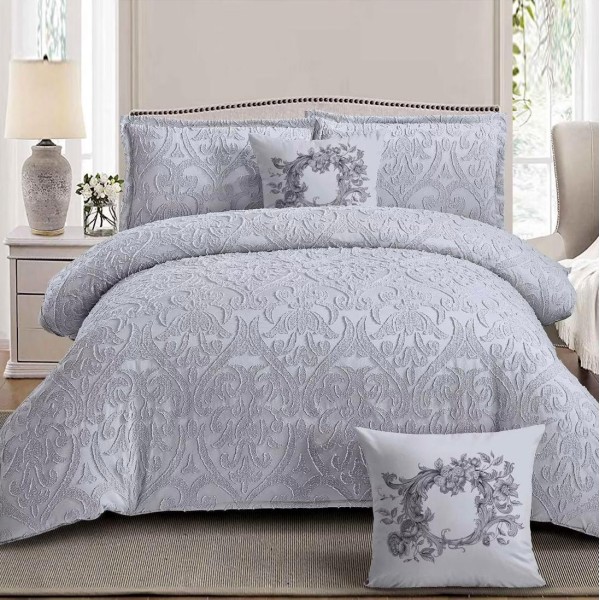 Lenjerie de pat dublu din finet satinat, 4 anotimpuri, cu smocuri brodate (tesatura din fabrica, ci nu imprimata, cu inaltime de 1 cm), confectionata din bumbac 100%, cu 6 piese. Materialul are un aspect lucios, cu smocuri brodate in relief, pentru o nota de eleganta si rafinament, facand astfel tesatura speciala atat prin calitate cat si prin design-ul sau unic.