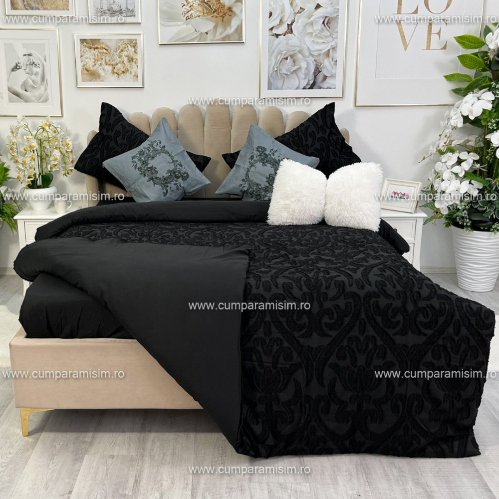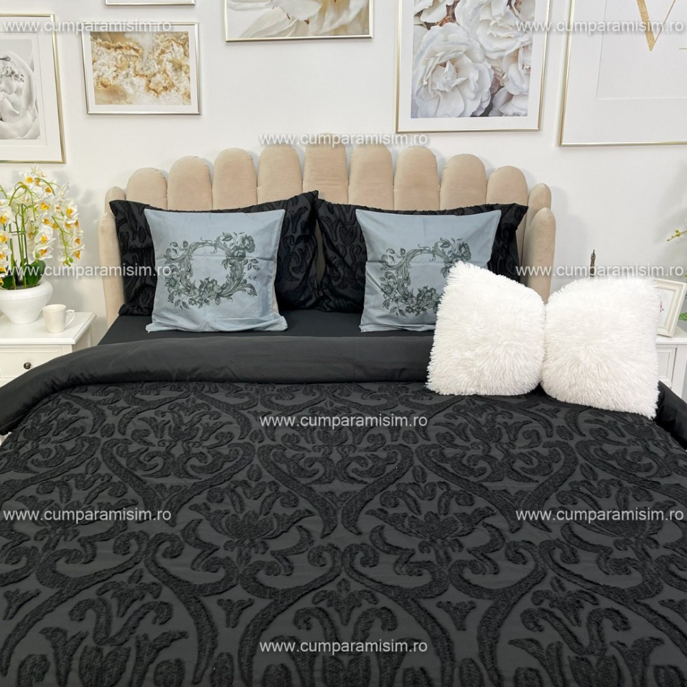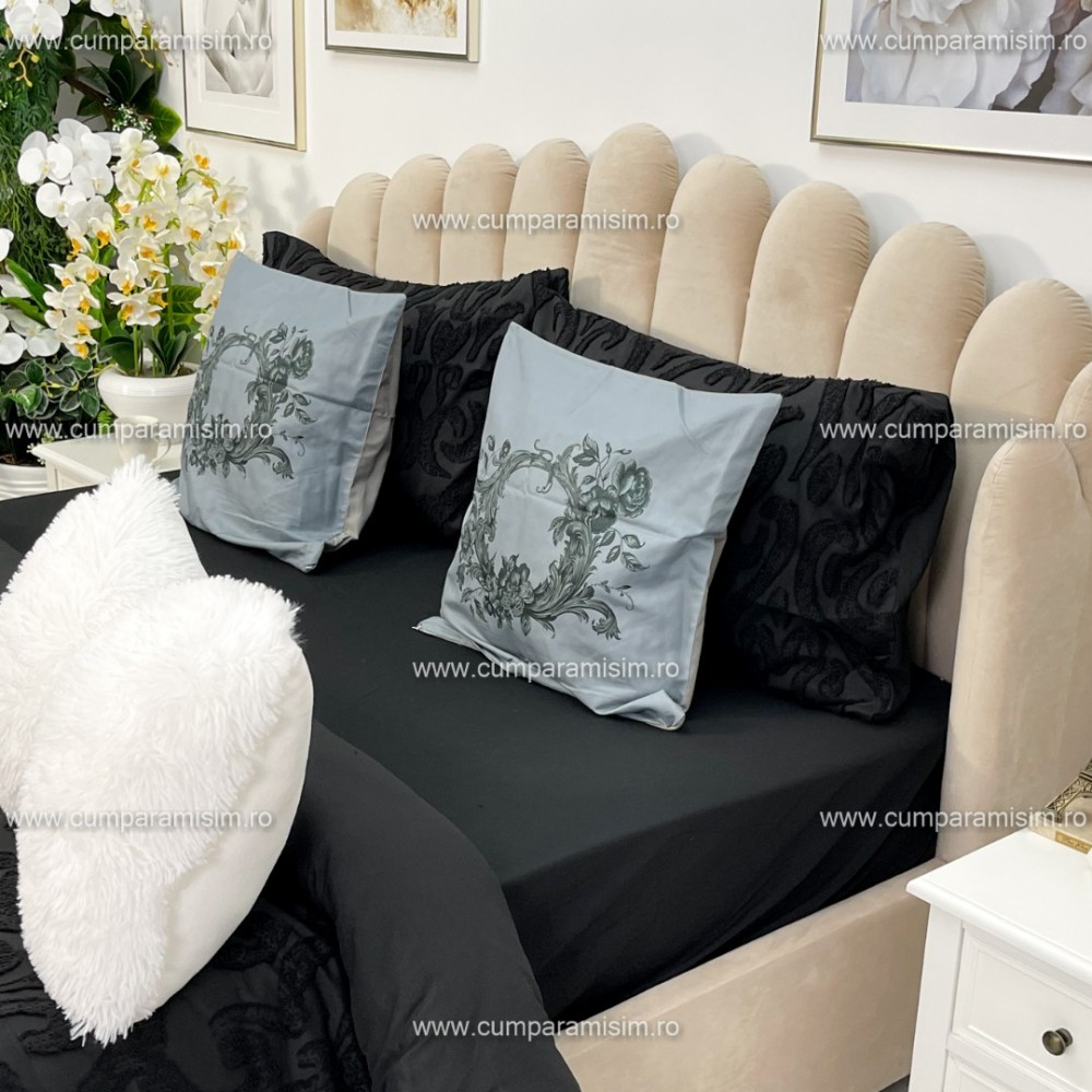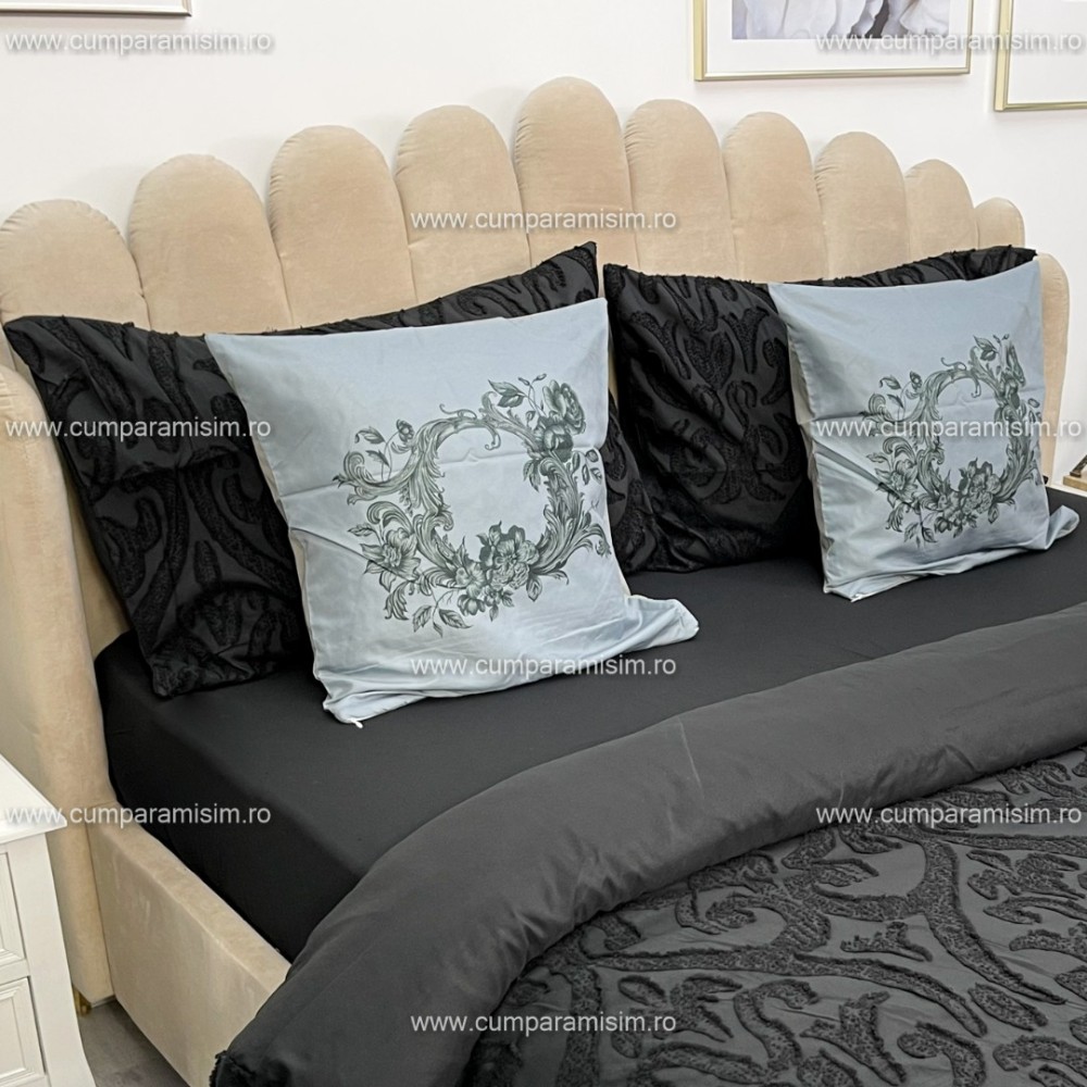 Lenjerie pat dublu, Finet Satinat Deluxe cu Smocuri Brodate, IDENTICA CU POZA, cu elastic, 4 anotimpuri, 6 piese, model oriental, negru, Primavara Casa, cod produs: PRC360