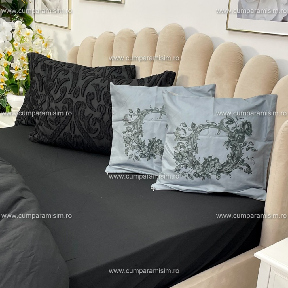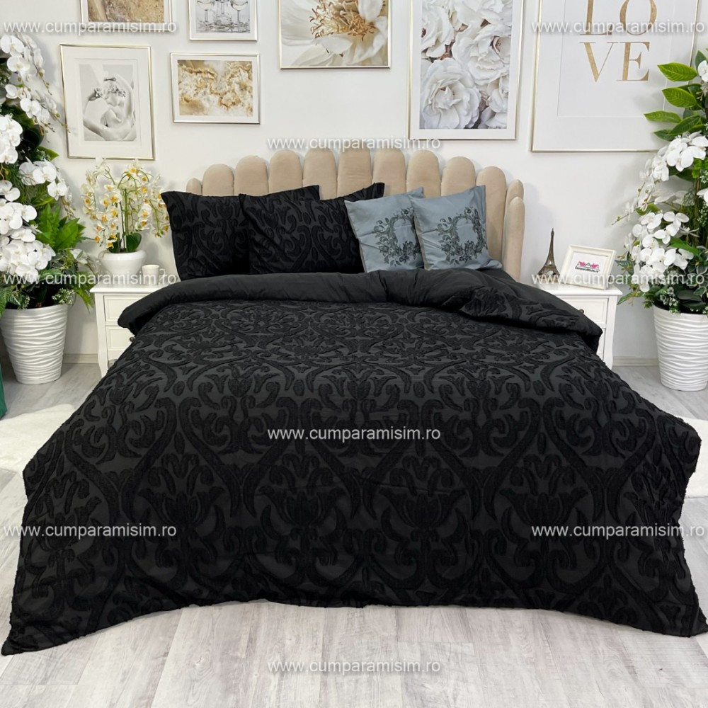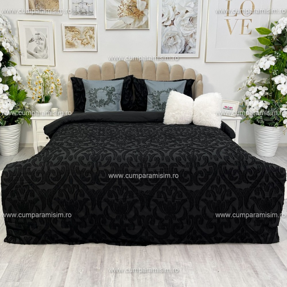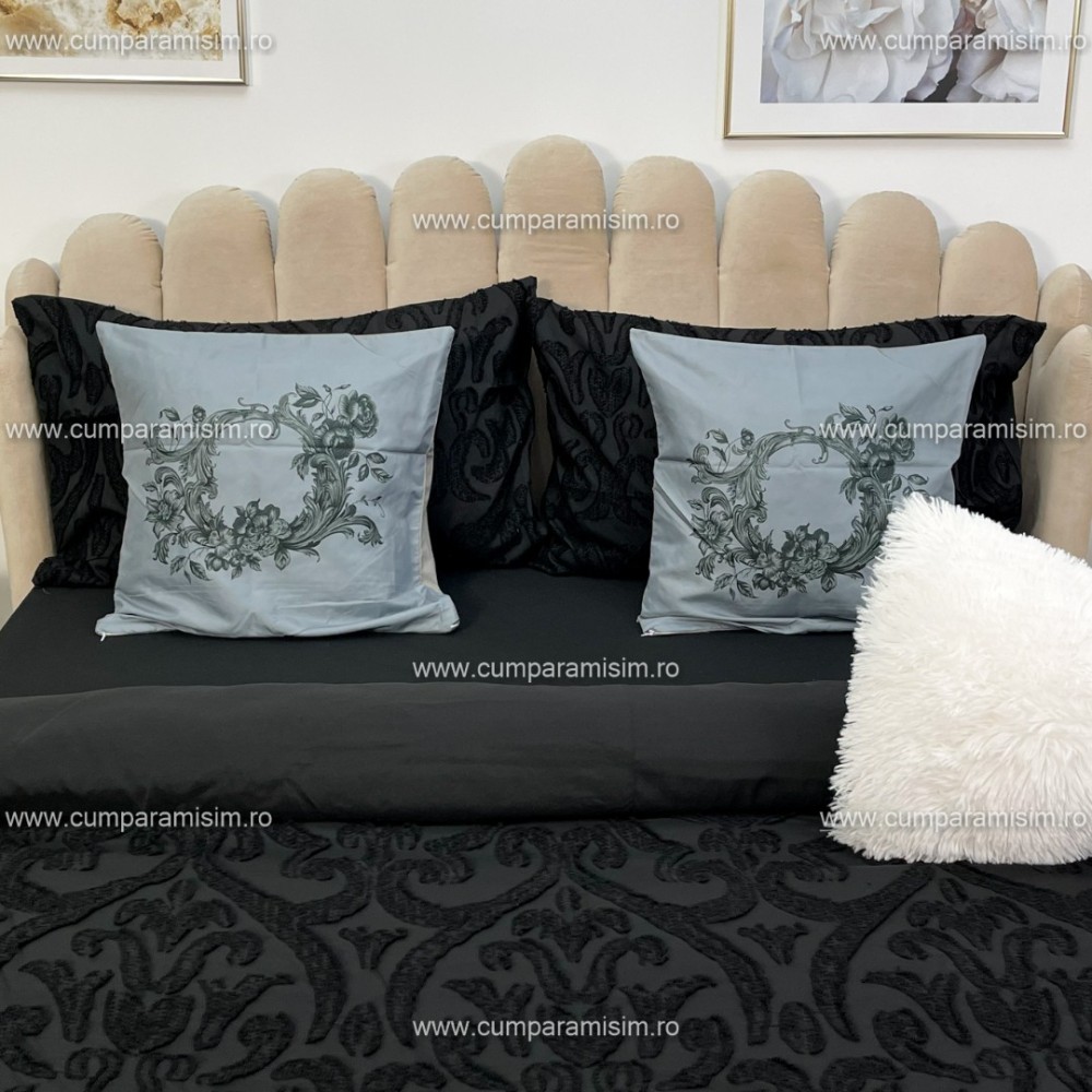 Lenjerie pat dublu, Finet Satinat Deluxe cu Smocuri Brodate, IDENTICA CU POZA, cu elastic, 4 anotimpuri, 6 piese, model oriental, negru, Primavara Casa, cod produs: PRC360