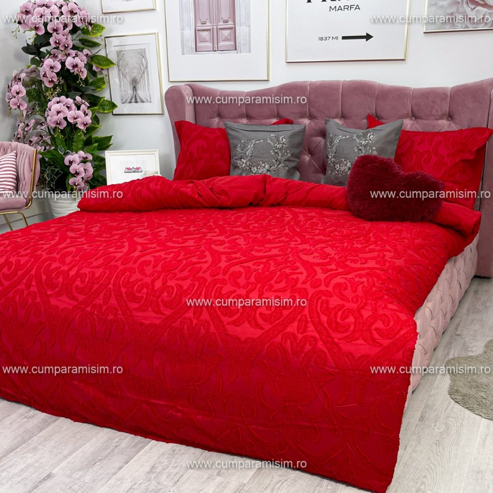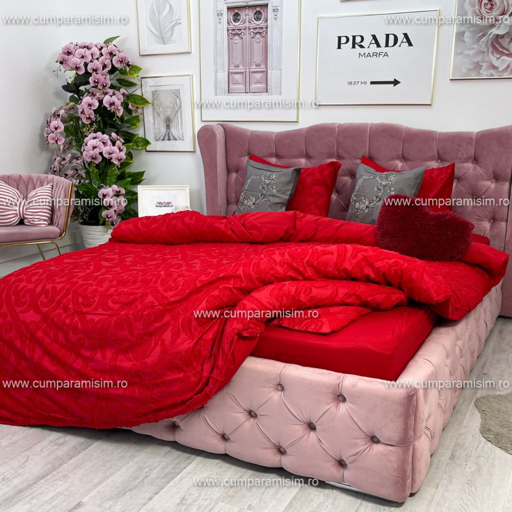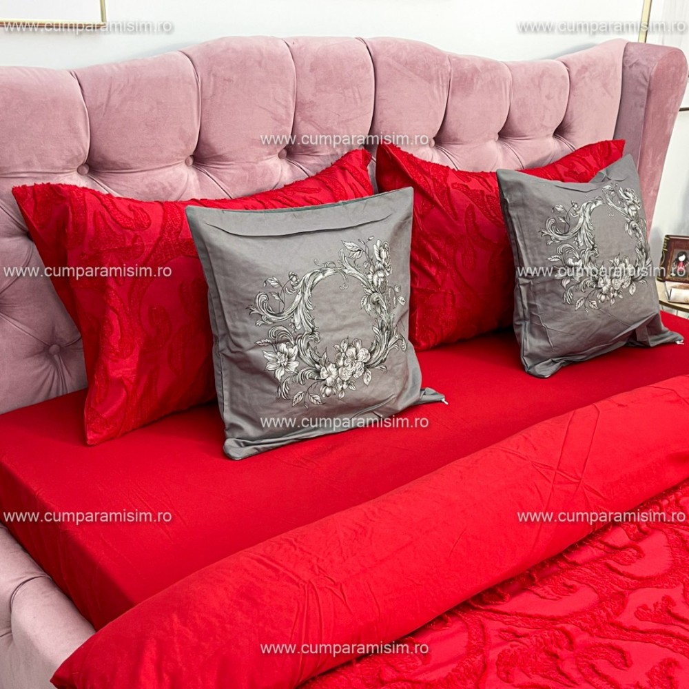 Lenjerie pat dublu, Finet Satinat Deluxe cu Smocuri Brodate, IDENTICA CU POZA, cu elastic, 4 anotimpuri, 6 piese, model oriental, rosu, Primavara Casa, cod produs: PRC361