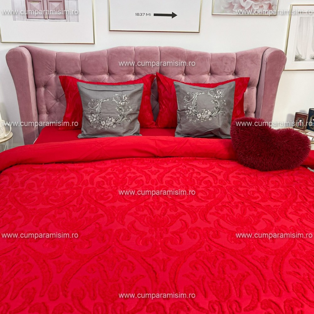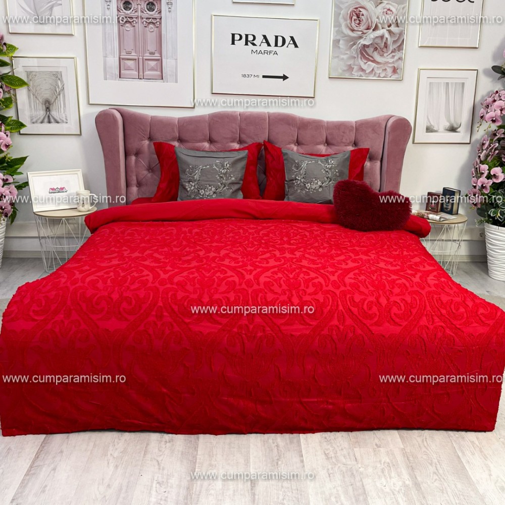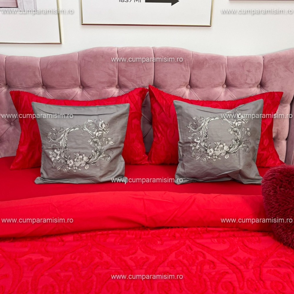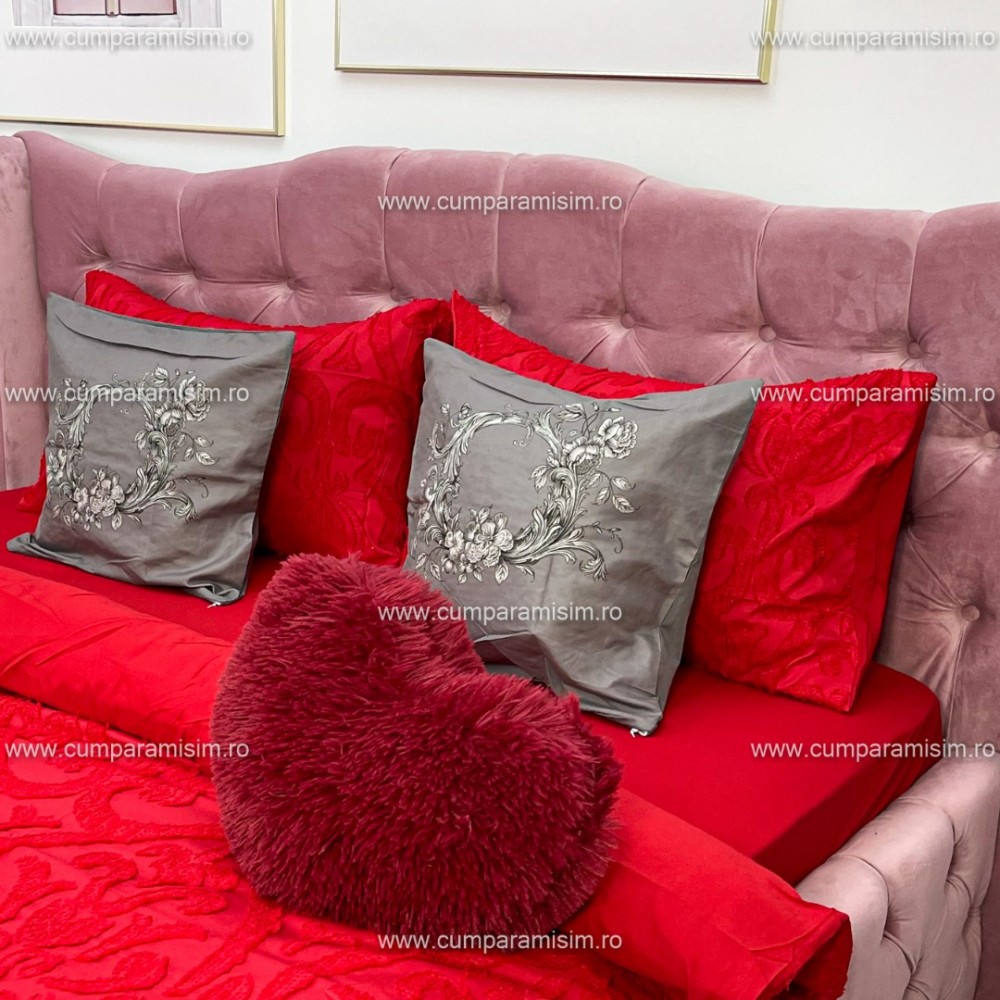 Lenjerie pat dublu, Finet Satinat Deluxe cu Smocuri Brodate, IDENTICA CU POZA, cu elastic, 4 anotimpuri, 6 piese, model oriental, rosu, Primavara Casa, cod produs: PRC361