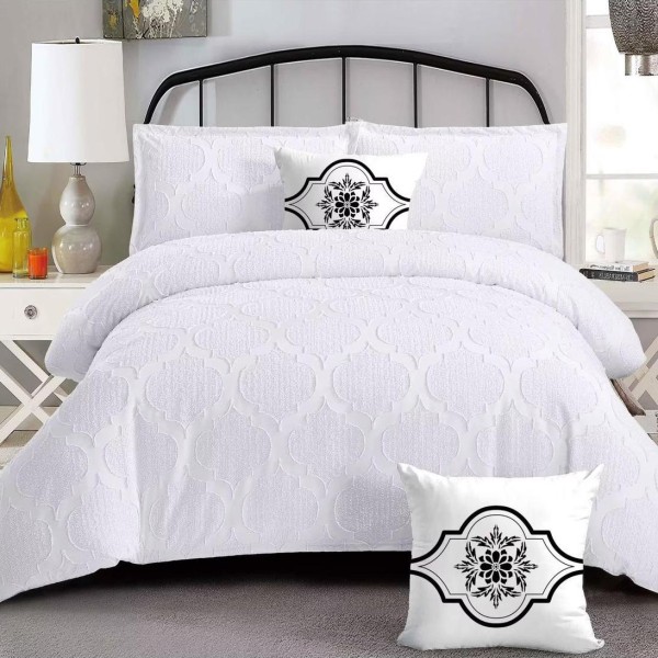 Lenjerie de pat dublu din finet satinat, 4 anotimpuri, cu smocuri brodate (tesatura din fabrica, ci nu imprimata, cu inaltime de 1 cm), confectionata din bumbac 100%, cu 6 piese. Materialul are un aspect lucios, cu smocuri brodate in relief, pentru o nota de eleganta si rafinament, facand astfel tesatura speciala atat prin calitate cat si prin design-ul sau unic.