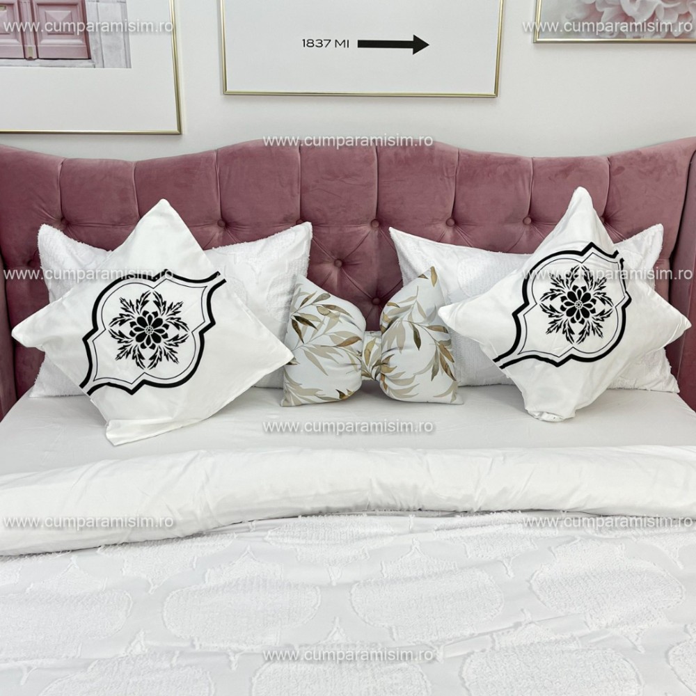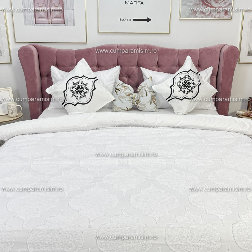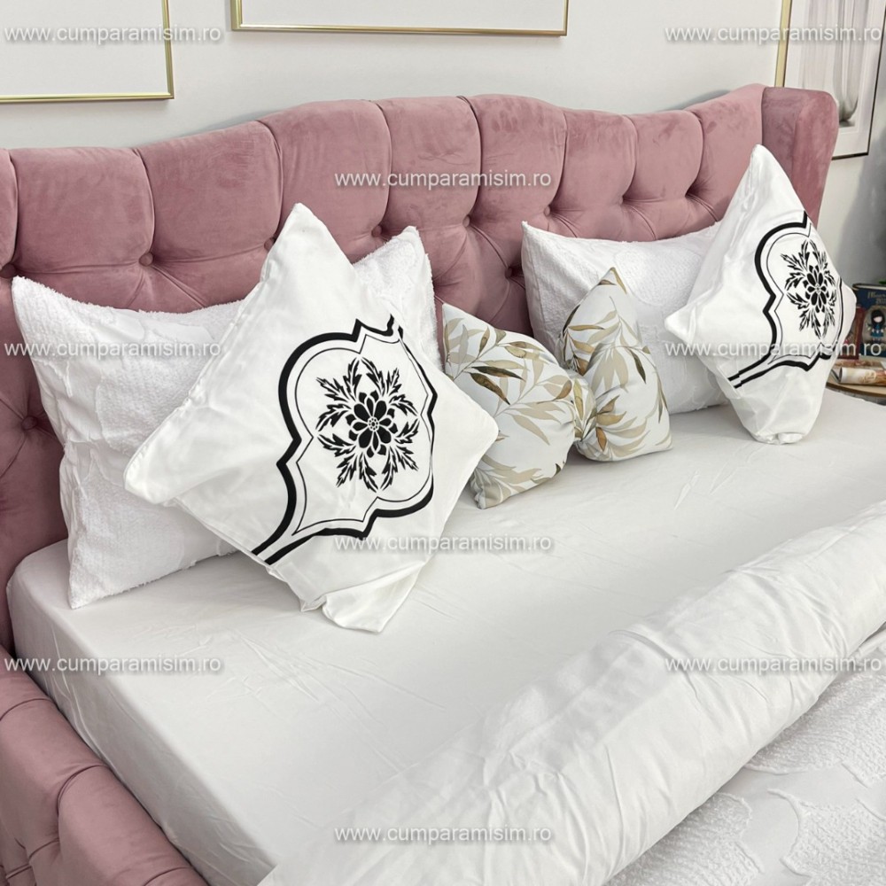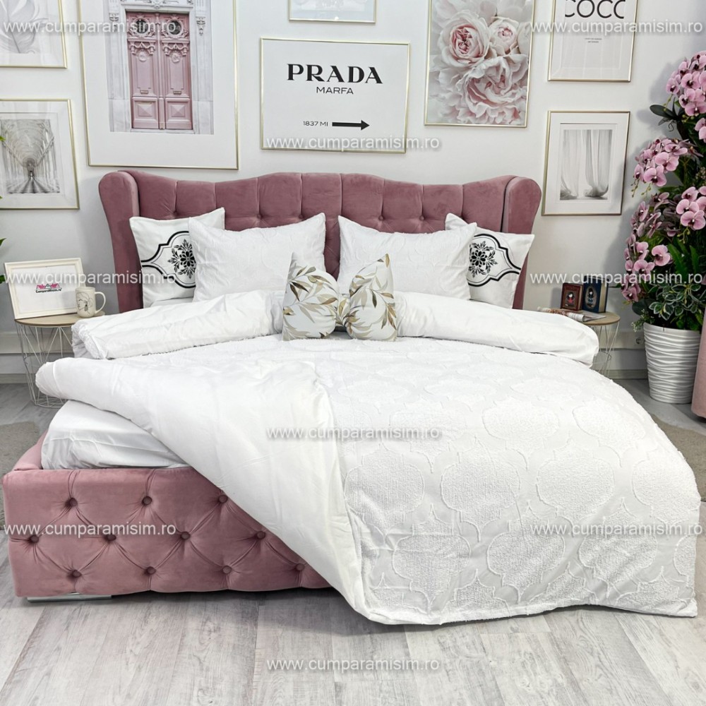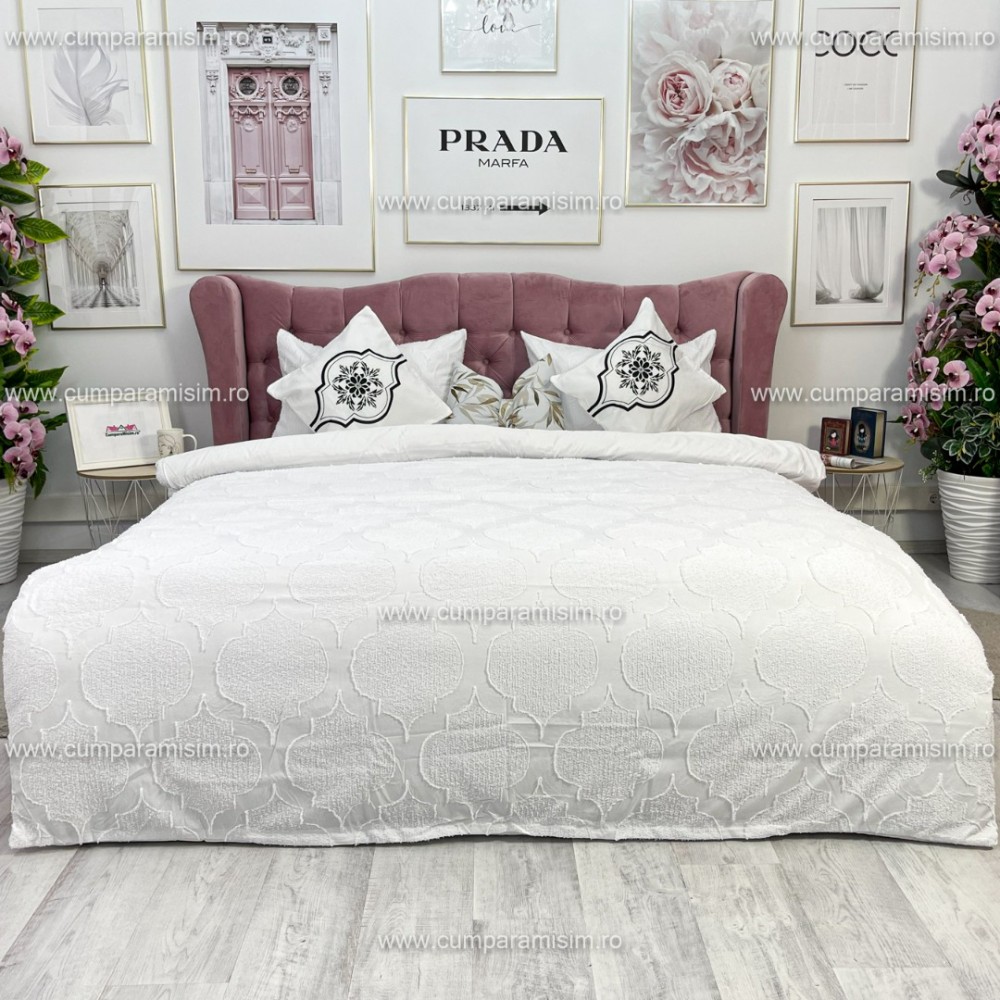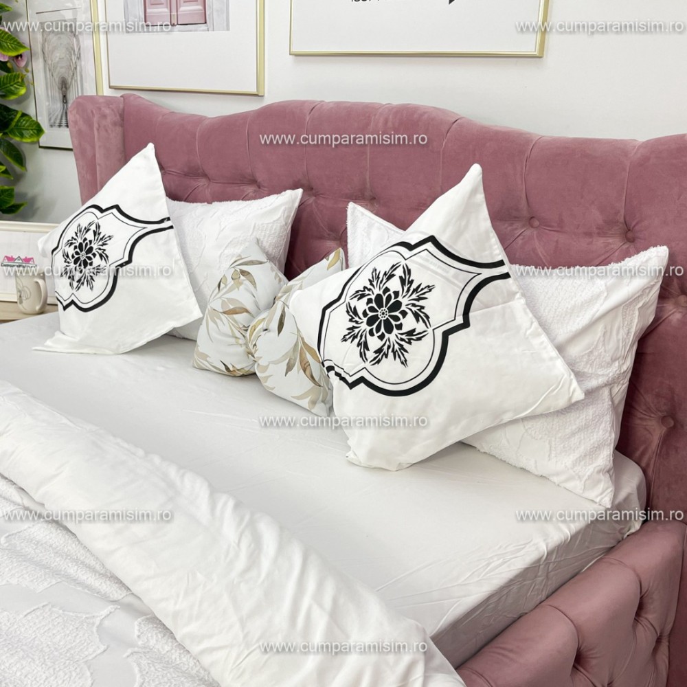 Lenjerie pat dublu, Finet Satinat Deluxe cu Smocuri Brodate, IDENTICA CU POZA, cu elastic, 4 anotimpuri, 6 piese, model royal, alb, Primavara Casa, cod produs: PRC400