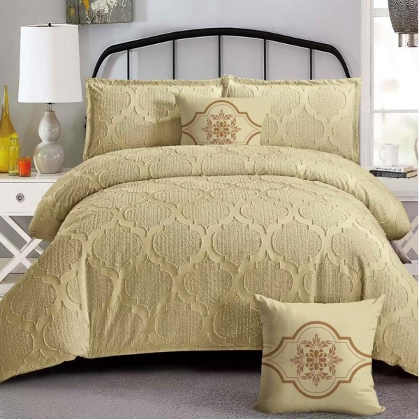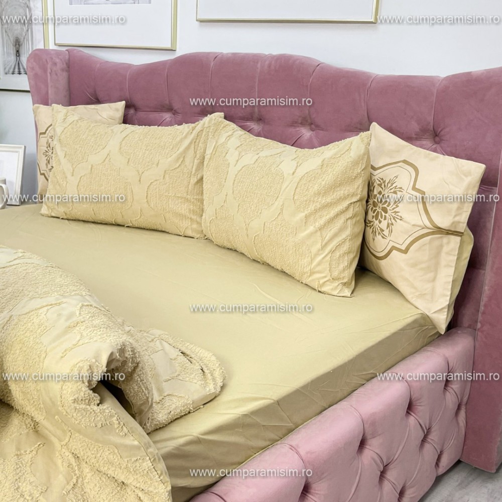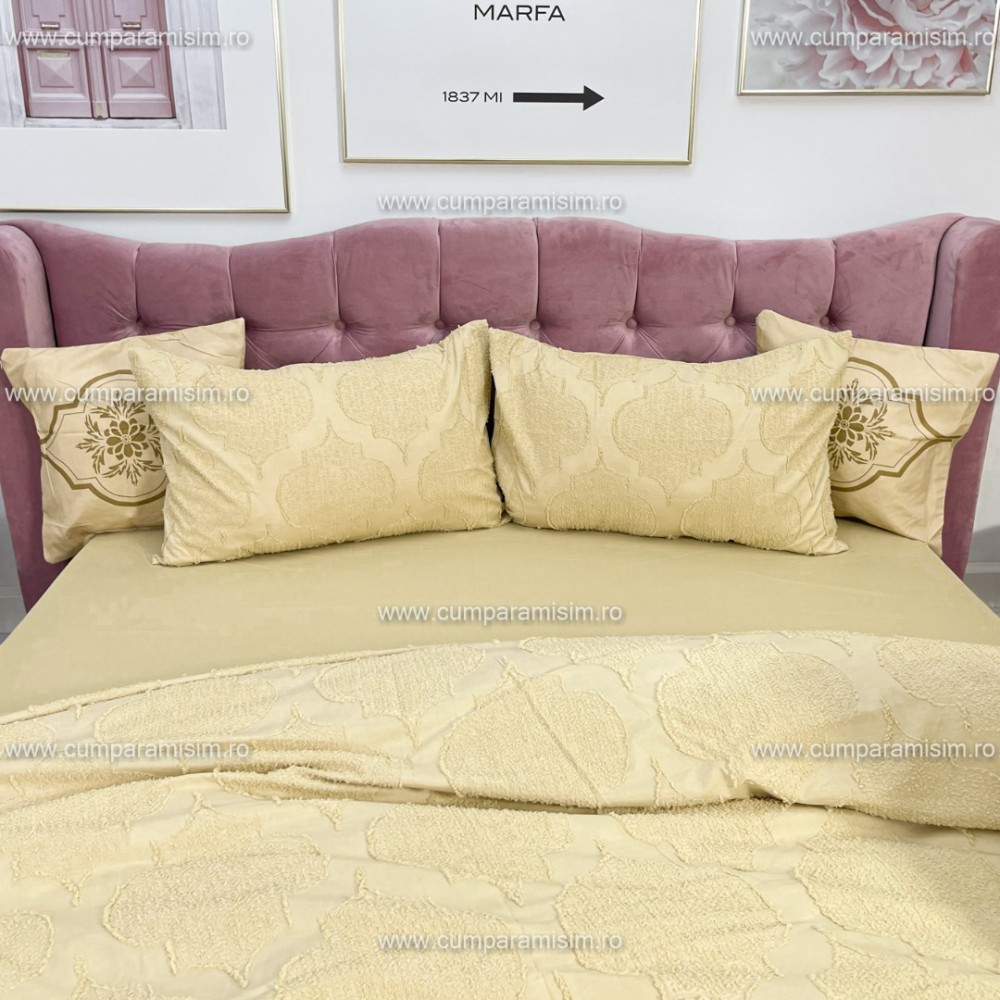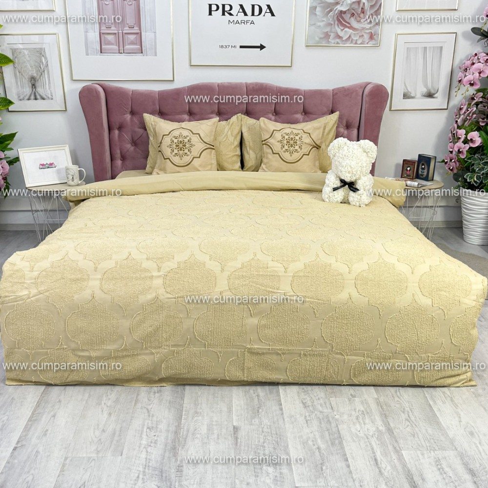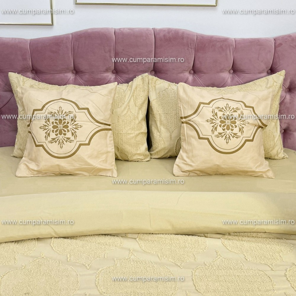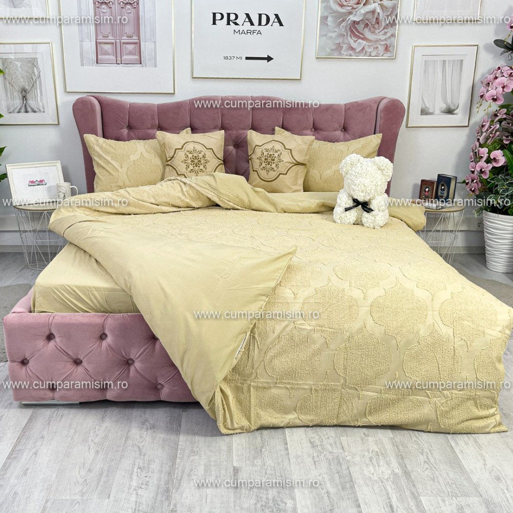 Lenjerie pat dublu, Finet Satinat Deluxe cu Smocuri Brodate, IDENTICA CU POZA, cu elastic, 4 anotimpuri, 6 piese, model royal, bej, Primavara Casa, cod produs: PRC402