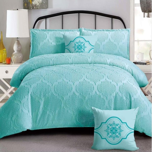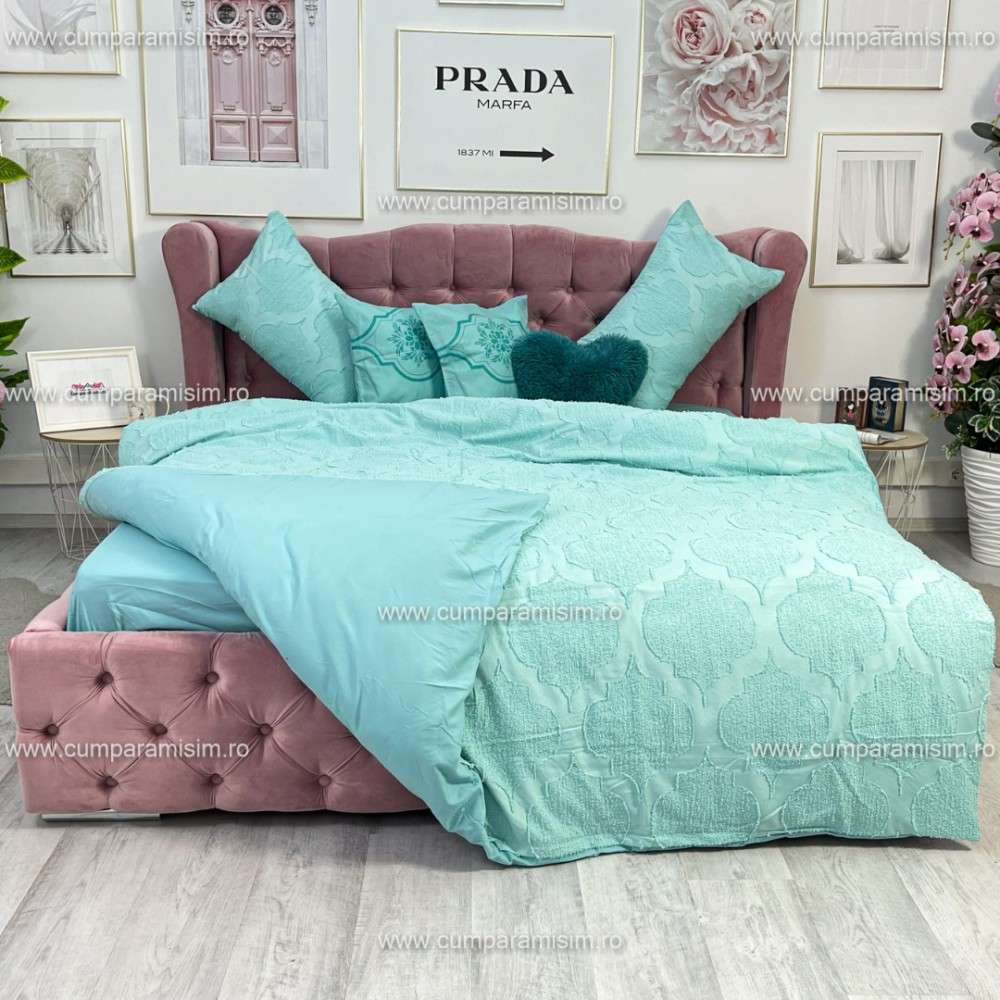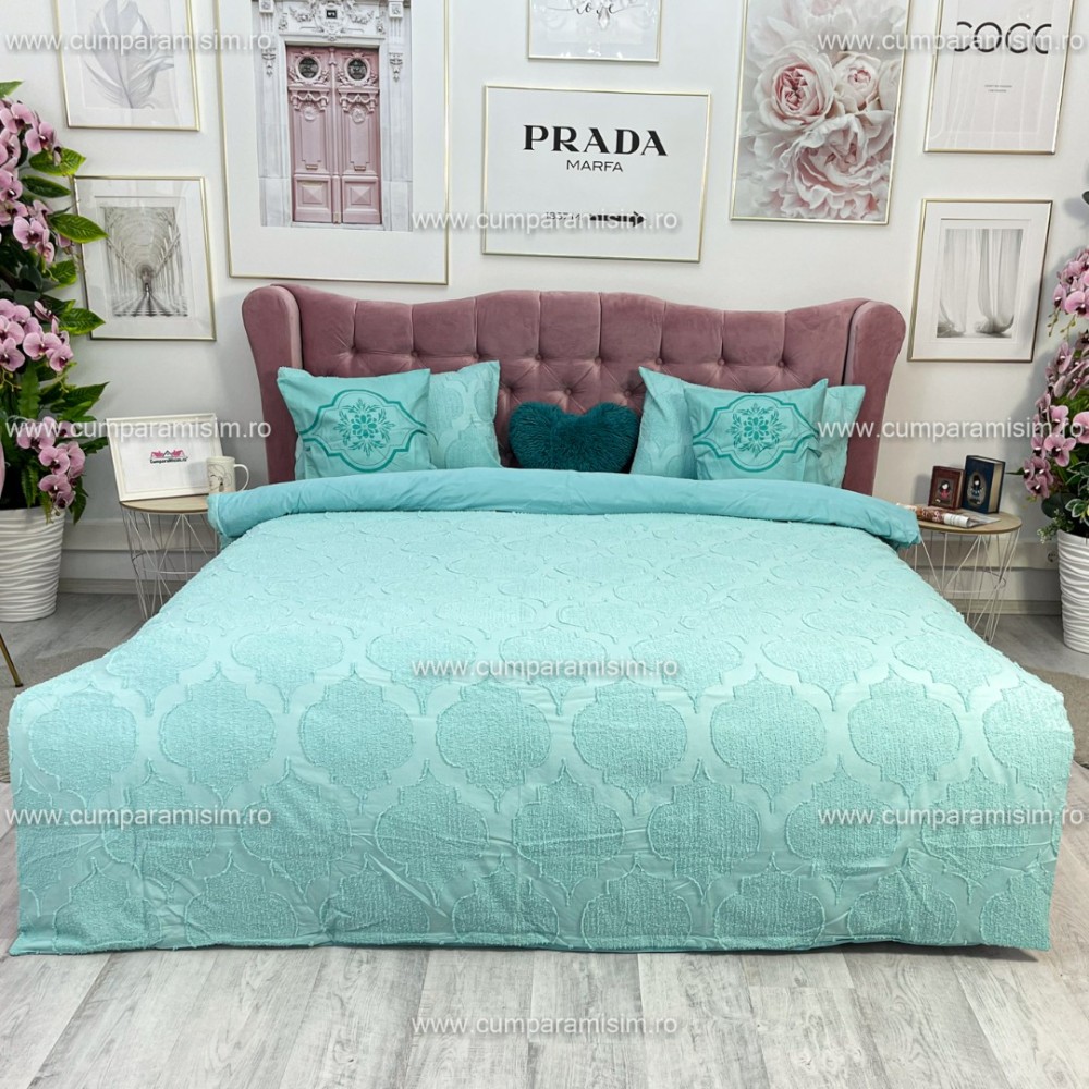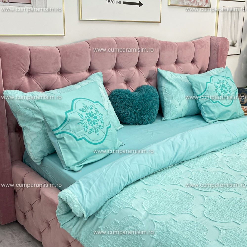 Lenjerie pat dublu, Finet Satinat Deluxe cu Smocuri Brodate, IDENTICA CU POZA, cu elastic, 4 anotimpuri, 6 piese, model royal, bleu aqua, Primavara Casa, cod produs: PRC407