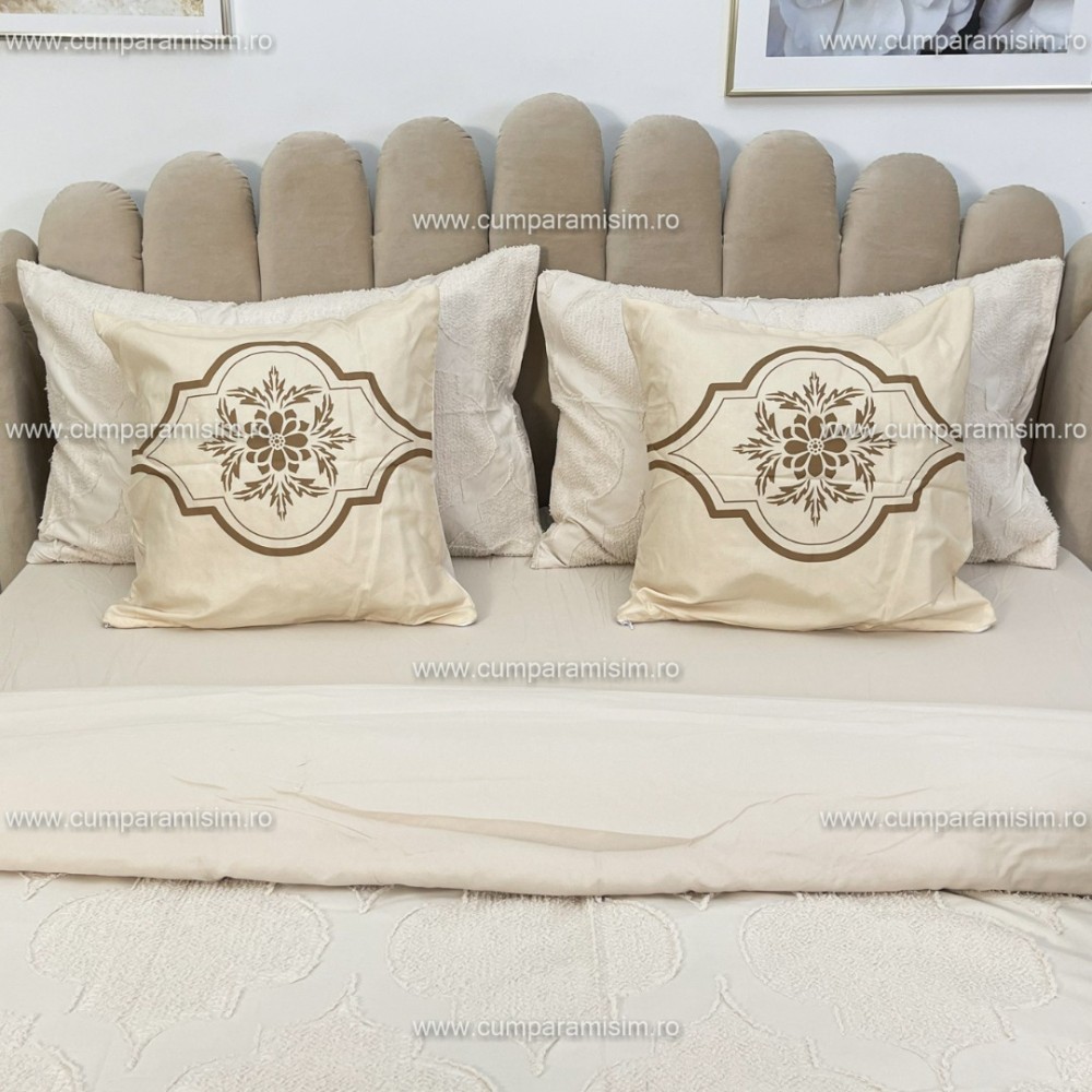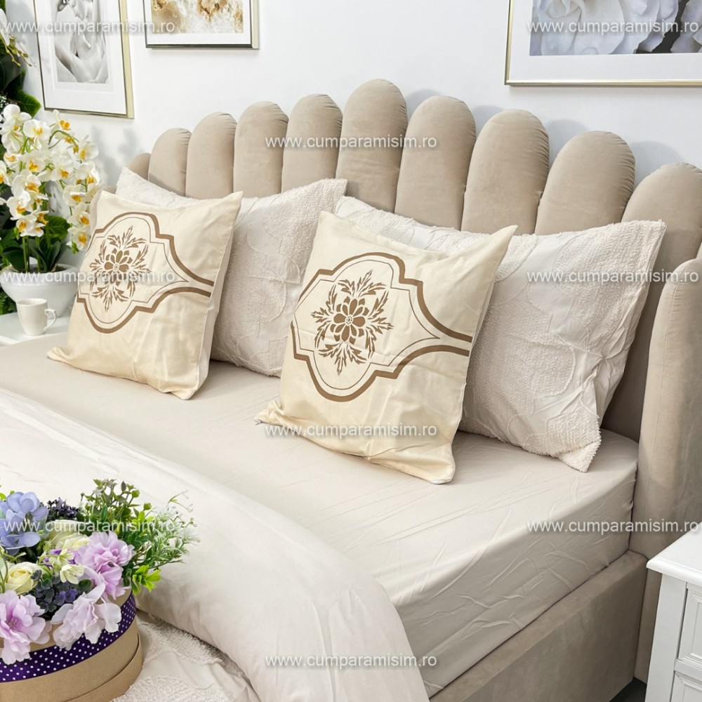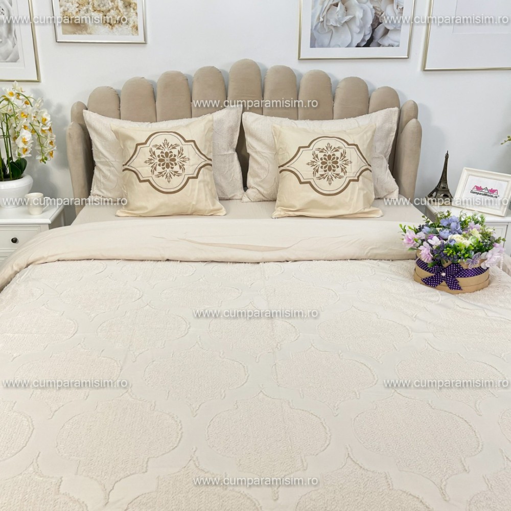 Lenjerie pat dublu, Finet Satinat Deluxe cu Smocuri Brodate, IDENTICA CU POZA, cu elastic, 4 anotimpuri, 6 piese, model royal, crem, Primavara Casa, cod produs: PRC401
