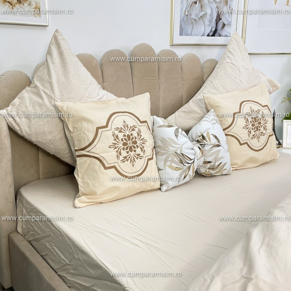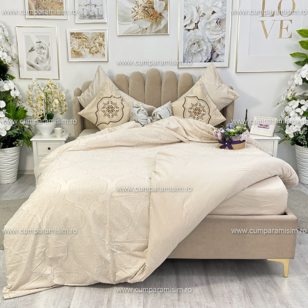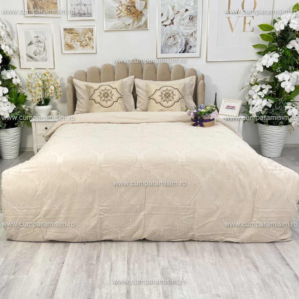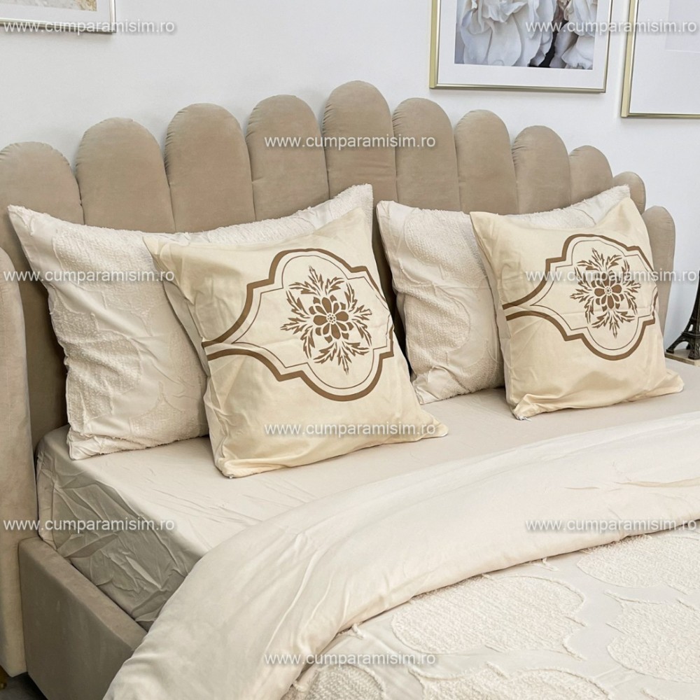 Lenjerie pat dublu, Finet Satinat Deluxe cu Smocuri Brodate, IDENTICA CU POZA, cu elastic, 4 anotimpuri, 6 piese, model royal, crem, Primavara Casa, cod produs: PRC401