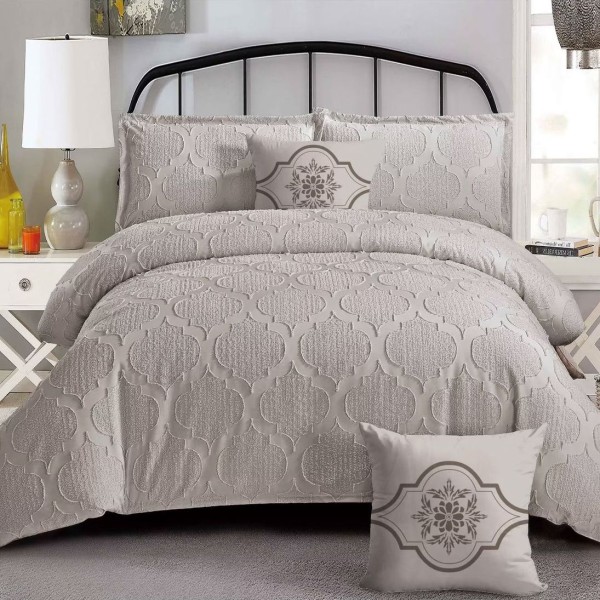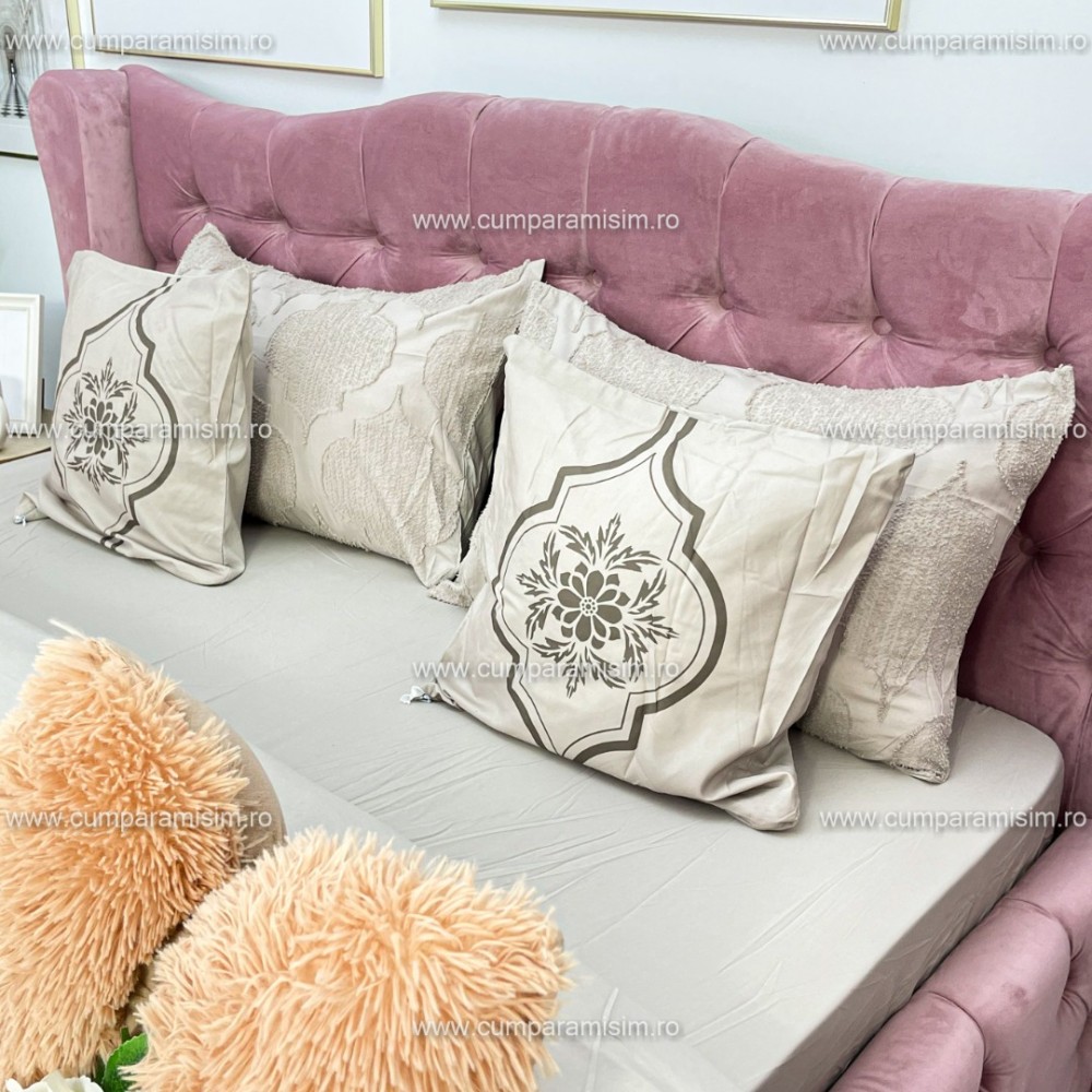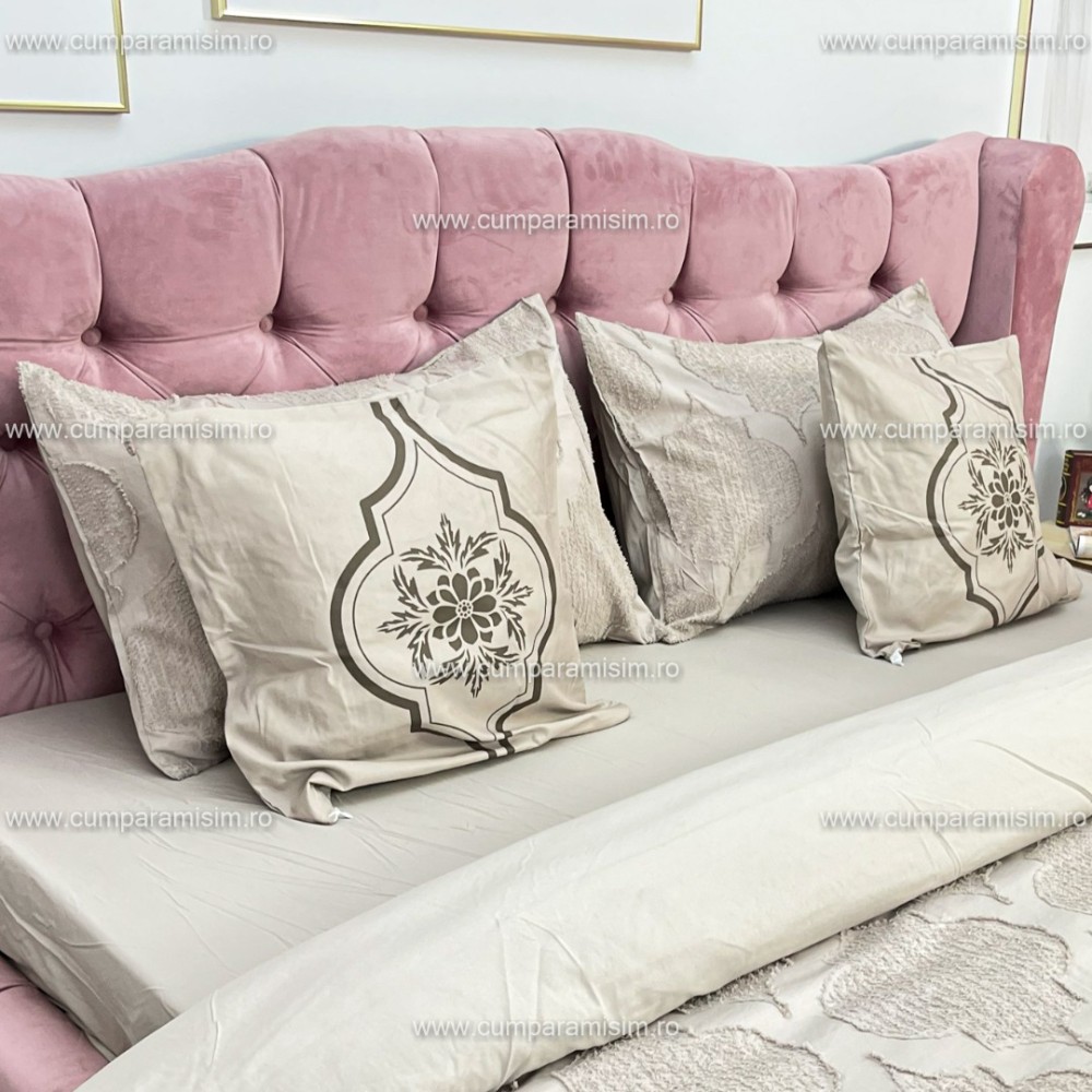Lenjerie pat dublu, Finet Satinat Deluxe cu Smocuri Brodate, IDENTICA CU POZA, cu elastic, 4 anotimpuri, 6 piese, model royal, grej, Primavara Casa, cod produs: PRC403
