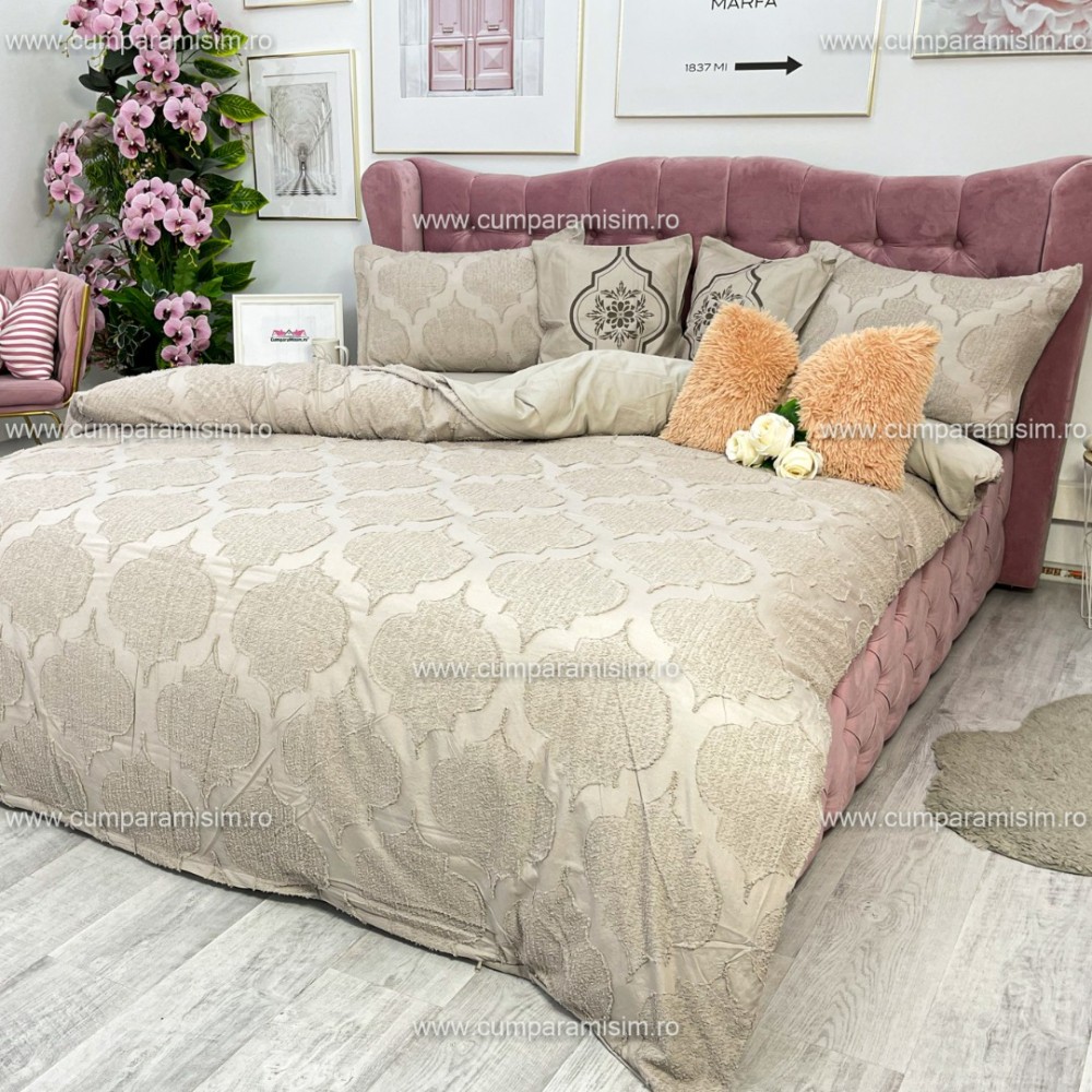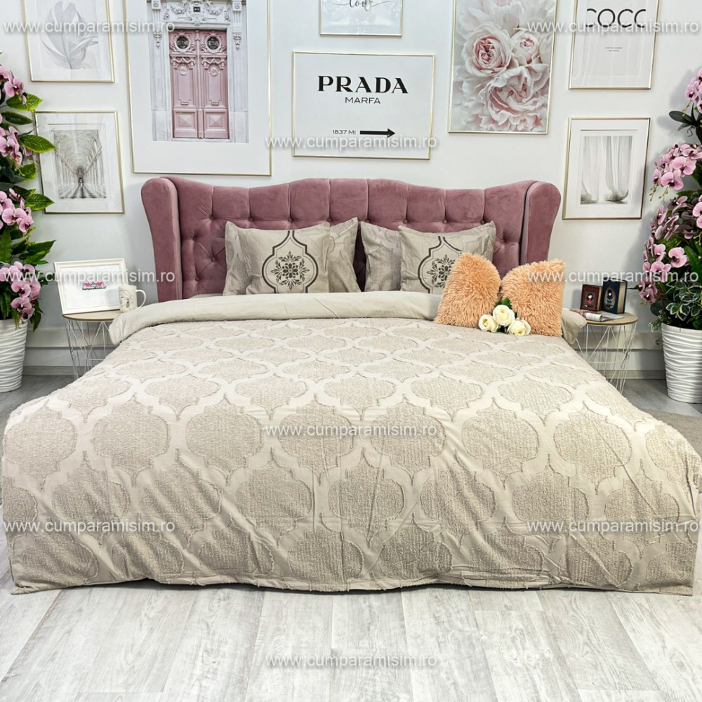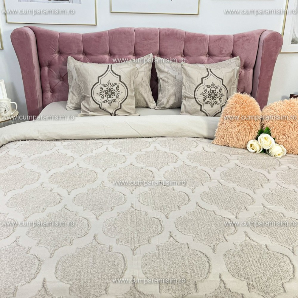 Lenjerie de pat dublu din finet satinat, 4 anotimpuri, cu smocuri brodate (tesatura din fabrica, ci nu imprimata, cu inaltime de 1 cm), confectionata din bumbac 100%, cu 6 piese. Materialul are un aspect lucios, cu smocuri brodate in relief, pentru o nota de eleganta si rafinament, facand astfel tesatura speciala atat prin calitate cat si prin design-ul sau unic.